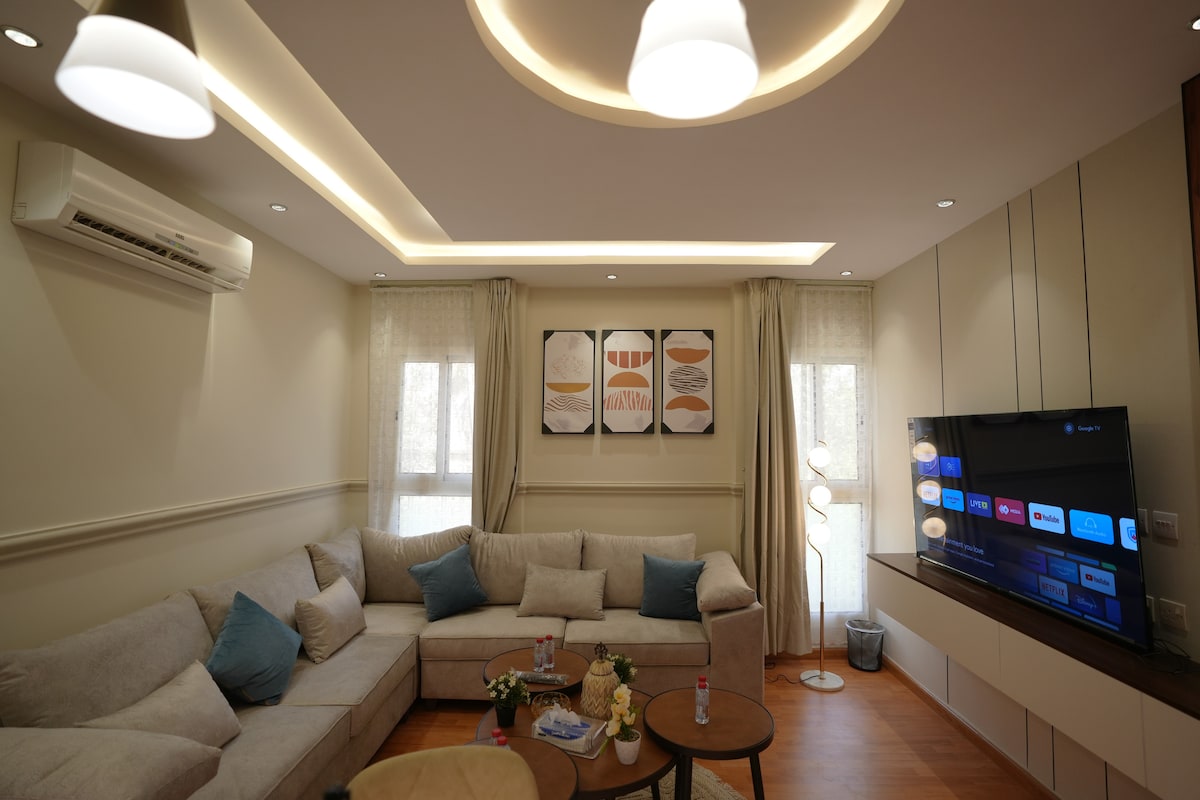 Cette résidence calme et élégante. Conçu dans un style moderne et contemporain, il vous offre tout ce dont vous avez besoin pour vivre confortablement et dans le luxe. L'appartement se compose d'une chambre confortable et d'un salon spacieux, offrant un espace idéal pour se détendre après une longue journée. Vous pouvez lire des livres et regarder des films sur Netflix et des chaînes cryptées et payantes, y compris toutes les chaînes sportives. L'emplacement du logement offre également un accès facile à divers services et installations.