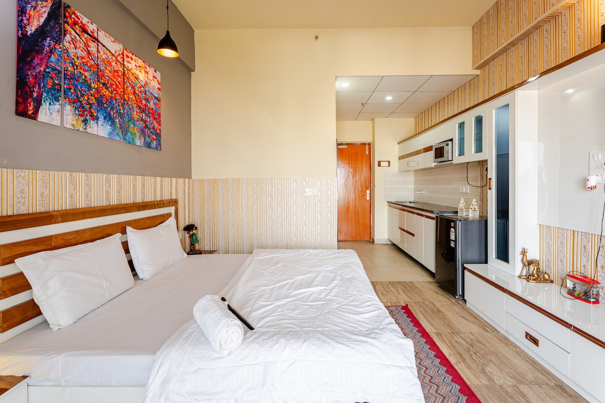 Experience a serene stay that blends modern and contemporary European aesthetics. With clean surroundings, curated details, and muted wall tones, the space offers a calm and sophisticated atmosphere ideal for couples or working professionals. Includes Free Parking. Close to Expo Ground The studio is equipped with essentials for a comfortable short stay, including a cozy bed, functional kitchenette, high-speed Wi-Fi. Perfect for those seeking a quiet retreat with effortless charm and convenience