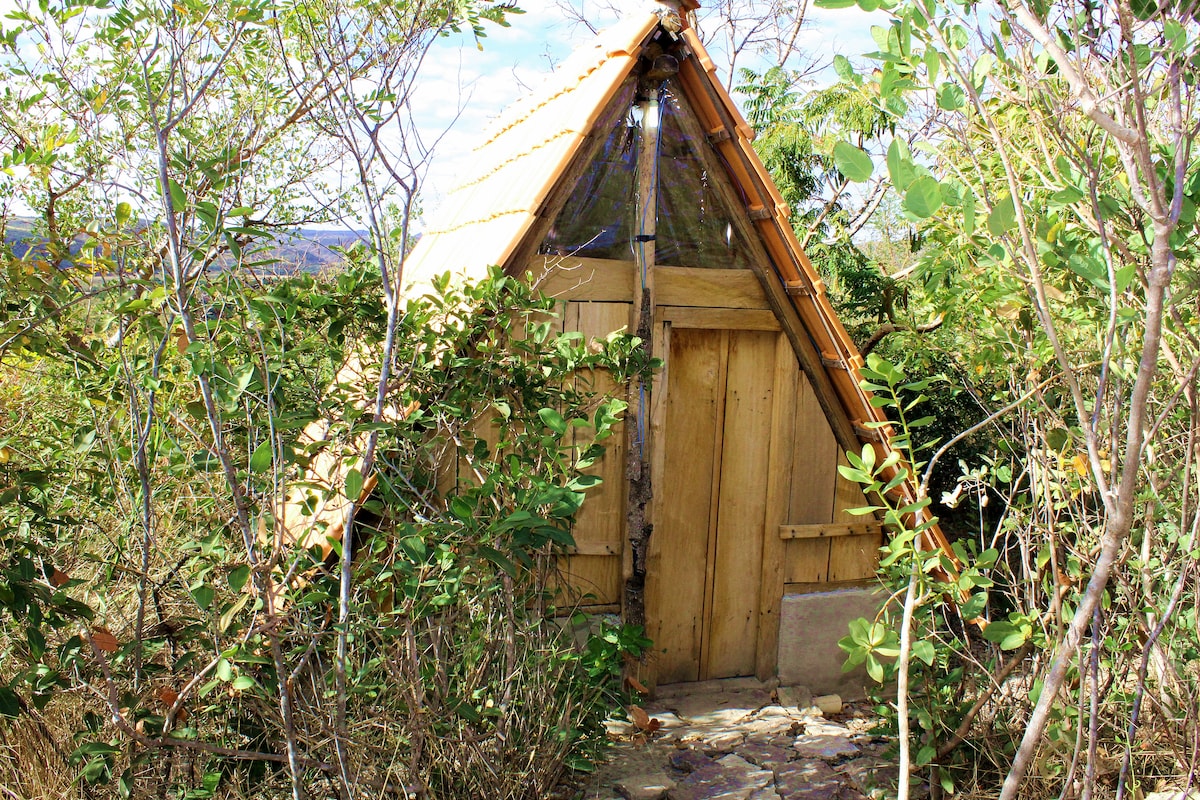 C'est une petite maison construite en permaculture, avec un lit double, une salle de bain complète, une douche chaude, des prises, un ventilateur, une moustiquaire, au milieu de la forêt de montagne, très proche des cascades, des grottes et des peintures rupestres. Avec une cuisine collective à disposition et un espace social couvert avec des tables pour travailler/étudier et manger. Une proposition de confort simple au milieu de la nature. En plus de cela, nous avons un service de cantine maison qui sert de la nourriture, des pâtes et des pizzas du Minas à des prix populaires