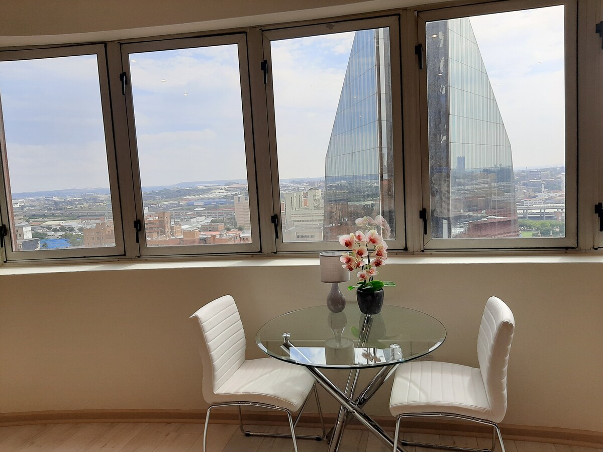 Sentez-vous en hauteur dans le ciel avec ce chalet à deux étages à Northcliff. Ce chalet indépendant peut accueillir confortablement 2 personnes avec une chambre privée attenante. 1er étage - Profitez d'un accès gratuit au Wi-Fi fibre non plafonné, Netflix, Showmax et DStv (complet). Balcon avec terrasse en bois, jacuzzi privé, cuisine avec cuisinière à gaz et plaque de cuisson, lave-vaisselle, climatisation, toilettes invités et télévision connectée. 2e étage - Chambre (1 lit superking, salle de bain attenante (douche et baignoire), TV (Netflix, Showmax et DStv (complet)) et climatisation.