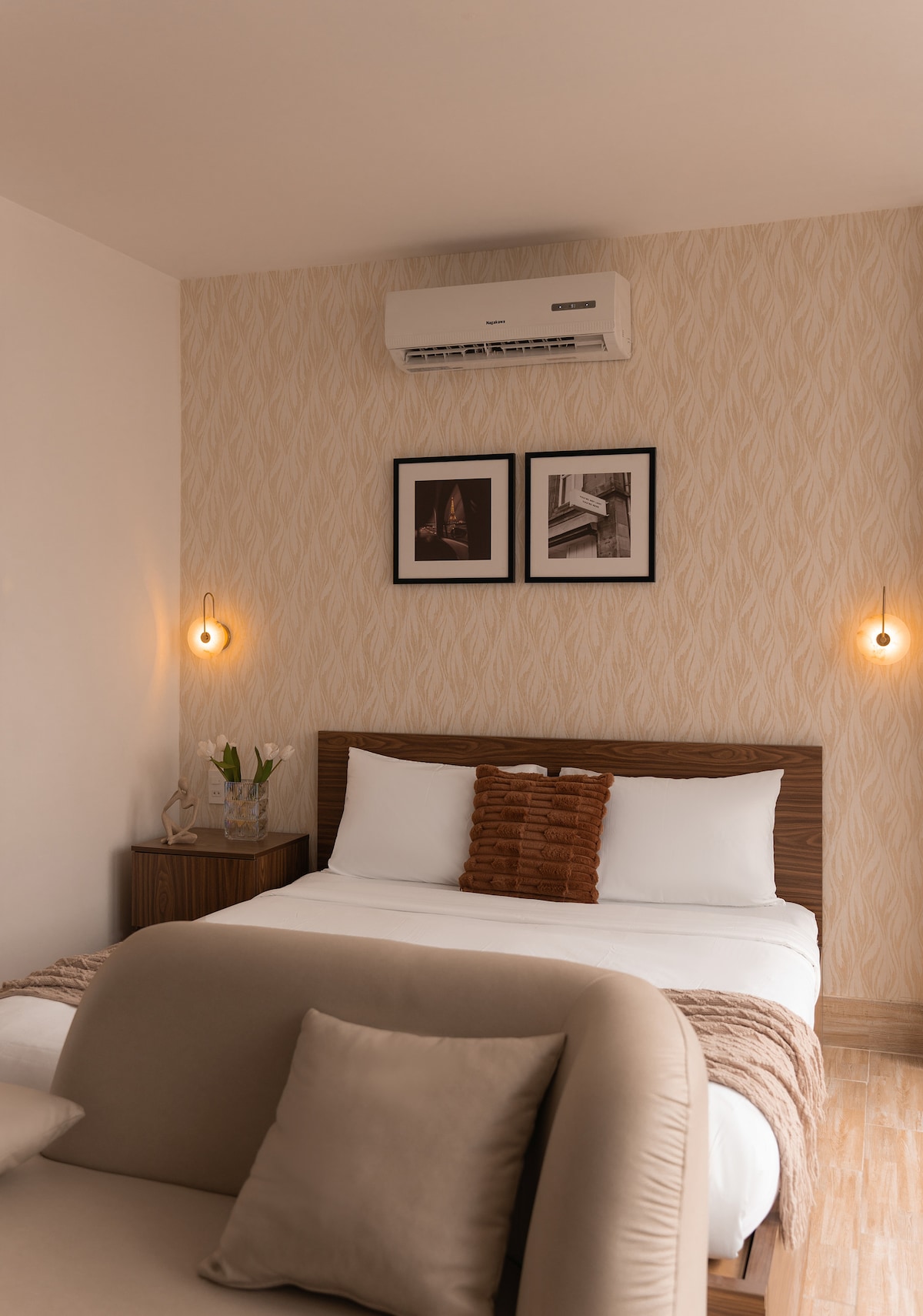 Studio spacieux de 27 m² récemment rénové dans une villa de 5 étages. Lumineux avec une grande fenêtre et un petit balcon pour l'air frais. La chambre est conçue dans un style minimaliste tropical. Lit Queen Size confortable, bureau, canapé-lit et télévision connectée avec Netflix. Idéalement situé à proximité de D1, D10 et de l'aéroport. À quelques minutes à pied de restaurants authentiques, de cafés confortables, de rues commerçantes animées et de cinémas comme CGV et Mega GS. Parfait pour les séjours longue durée, ce mélange de confort, de style et de commodité.