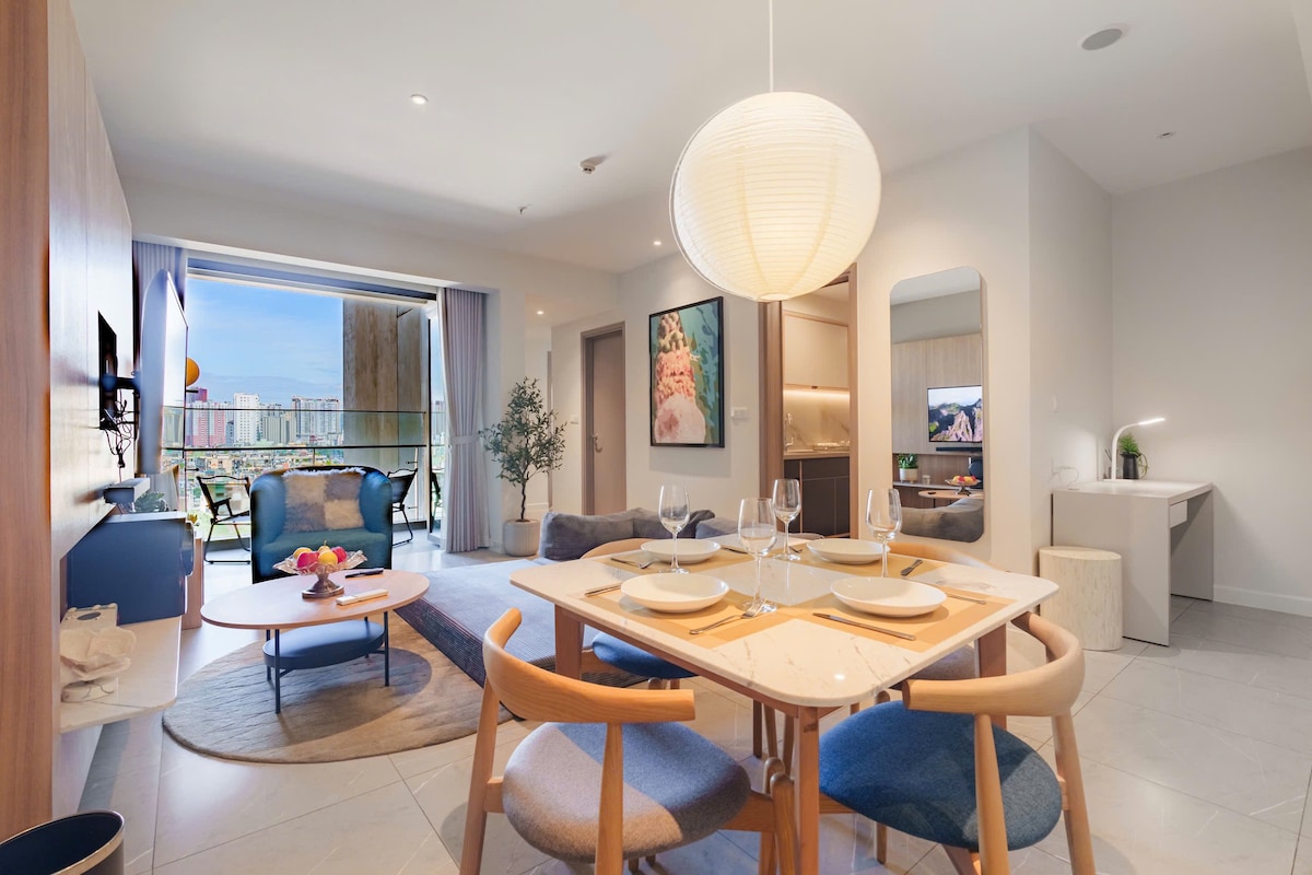 Bienvenue dans l'appartement de 3 chambres et 2 salles de bain de Thomas, situé à Zenity – Une résidence moderne 5 étoiles au cœur du District 1 Le salon dispose d'un balcon avec une vue imprenable sur les sites emblématiques de la ville La cuisine ouverte est équipée d'appareils électroménagers haut de gamme et d'un design contemporain élégant Les chambres principales sont élégamment meublées avec une literie haut de gamme, assurant un séjour reposant pour tout votre groupe/famille