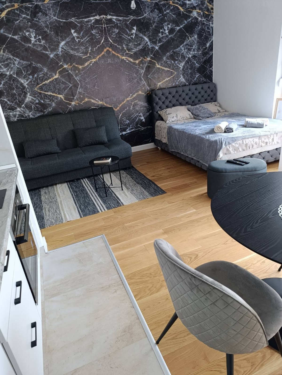 Détendez-vous et profitez en famille ou entre amis dans un environnement paisible et agréable. La suite est toute neuve, conçue pour notre famille, mais nous serons heureux de partager cet espace, que nous avons soigneusement conçu avec vous ! Une chambre confortable avec un lit double, vous permettra de faire une sieste plus longue pendant que vos enfants regardent des dessins animés depuis leur lit dans le salon. Avec un café sur la terrasse, vous pourrez vous détendre complètement et respirer l'air raffiné par la forêt de Divchibar. Il y a un parking privé devant le bâtiment.