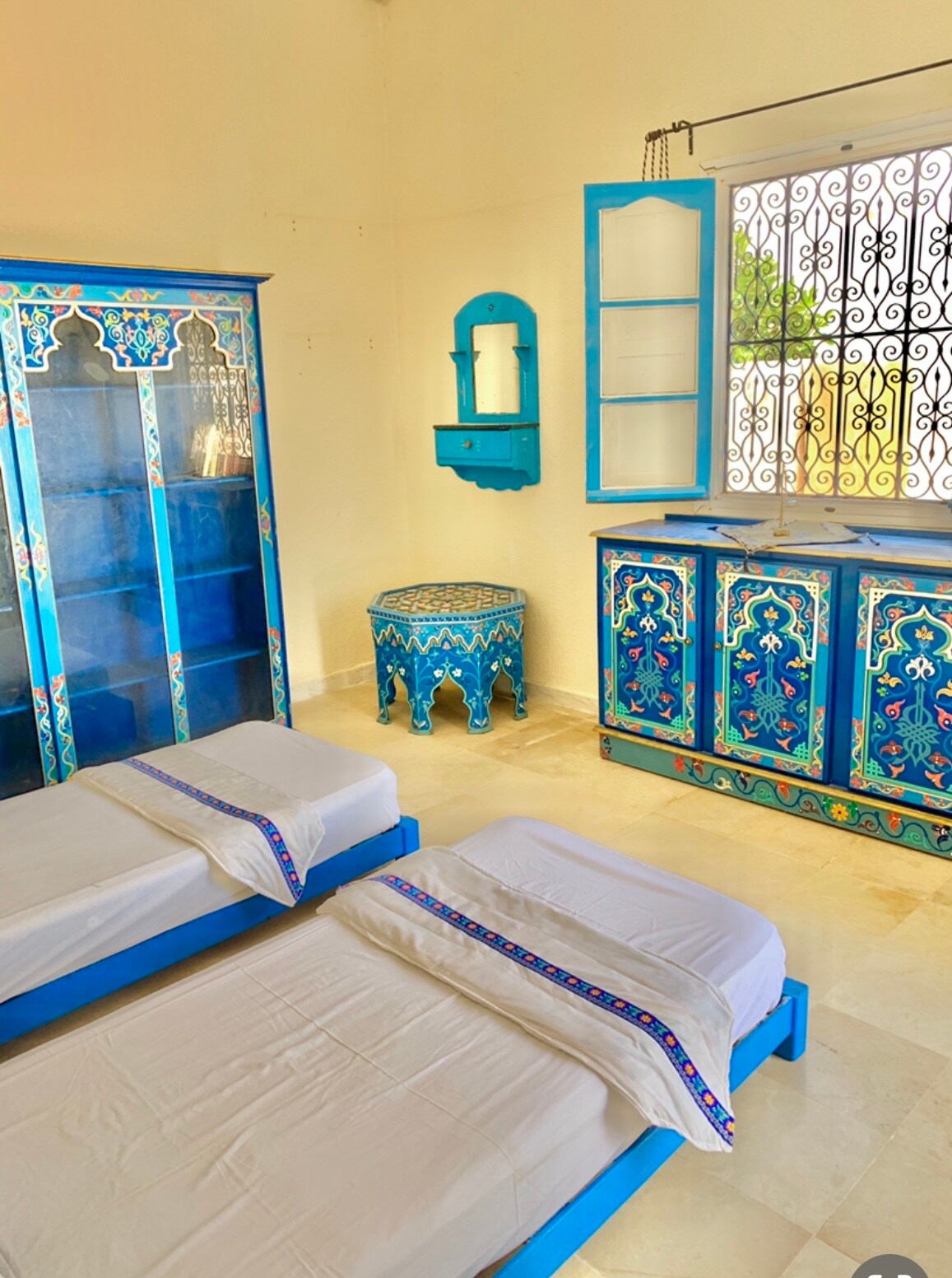 Houch d’exception situé dans la rue la plus charmante et photographiée d’Erriadh, au cœur du célèbre quartier artistique Djerbahood. Profitez de 2 chambres climatisées, d’un patio lumineux, d’une piscine privée et d’une terrasse aménagée. Cuisine équipée, Wi-Fi rapide, stationnement facile. Idéal pour couples, familles ou amis. Location de voiture possible et délicieux plats djerbiens faits maison sur commande. Un cadre unique, calme et authentique pour vivre Djerba.