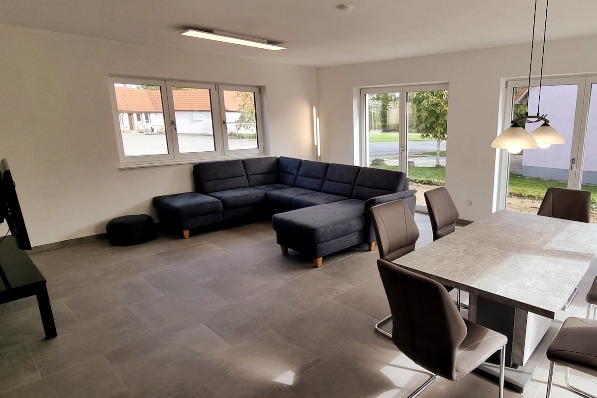 Détendez-vous dans ce logement. Situation calme, en pleine nature. Idéalement situé entre Rothenburg ob der Tauber et Dinkelsbühl, la plus belle vieille ville d'Allemagne. Point de départ idéal pour vos excursions d'une journée. Ou une promenade dans le parc naturel de Frankenhöhe et un lac de baignade est également à proximité. Notre logement a été entièrement reconstruit et joliment décoré pour préparer quelques jours inoubliables à nos clients. Accès très pratique par la porte d'entrée avec code numérique.
