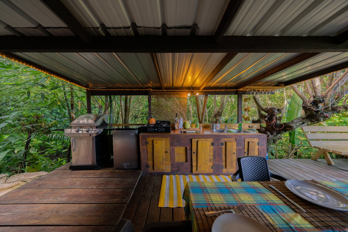 Cozy tropical bungalow 100m from Cosón Beach. Ideal for 2 guests, with queen bed, overhead mosquito net, AC, stand & ceiling fan, equipped kitchen, water cooler dispenser, BBQ, private bath & WiFi (Starlink). Enjoy nature, peace, and easy beach access. Set in a peaceful garden with private parking. Enjoy calm, surf-perfect waves, trails, and river Balatá nearby. Walk to Luis Restaurant and Hotel Restaurant Casa Cosón. No pets. Smoking only on terrace. Surf & paddle board, bikes & kayak for rent.