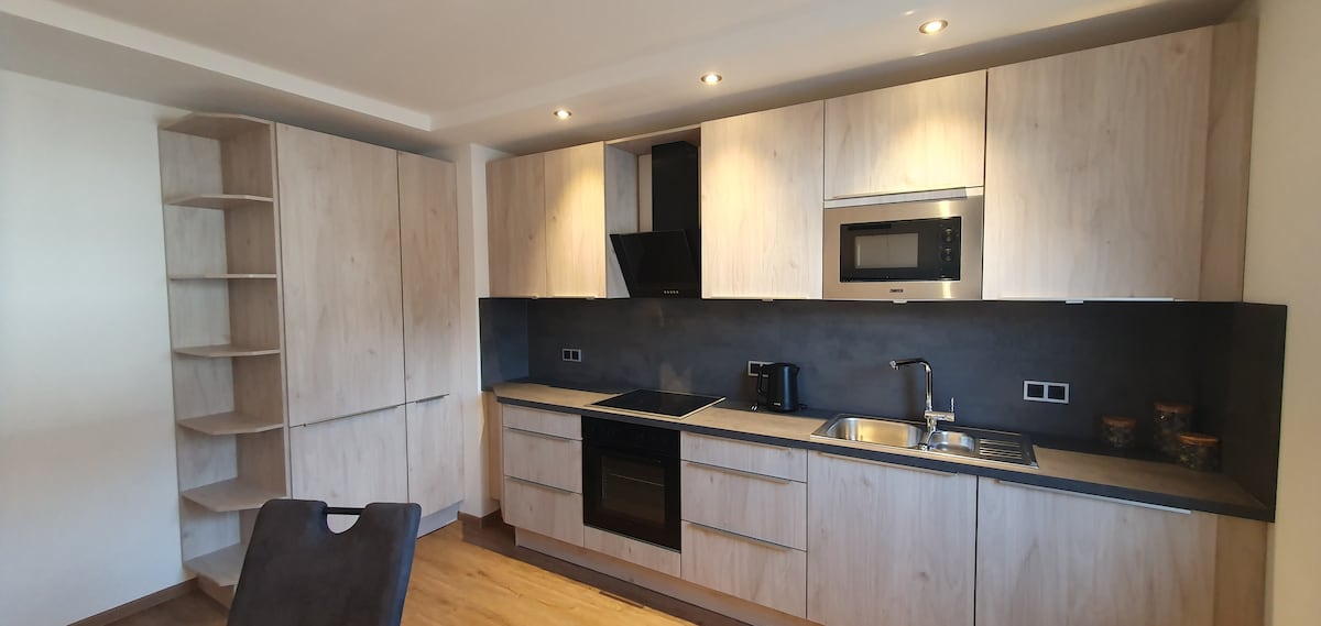 Entspann dich in dieser einzigartigen Unterkunft. Direkt am Waldrand gelegen, wo Bäume durch die große Terrasse wachsen, kannst du auf 37qm die Seele baumeln lassen. Ausgestattet mit 2 Betten (1 Doppelbett, 1 Einzelbett, 1 Schlafcouch), Smart-TV, kleinem Arbeitsplatz, Küche, Wohnzimmer und einem traumhaften Ausblick bietet dieses Apartment alles was das Herz begehrt. Ob für einen Kurzurlaub oder einem Fleckchen Erde, um entspannt arbeiten zu können - hier bist du richtig.
