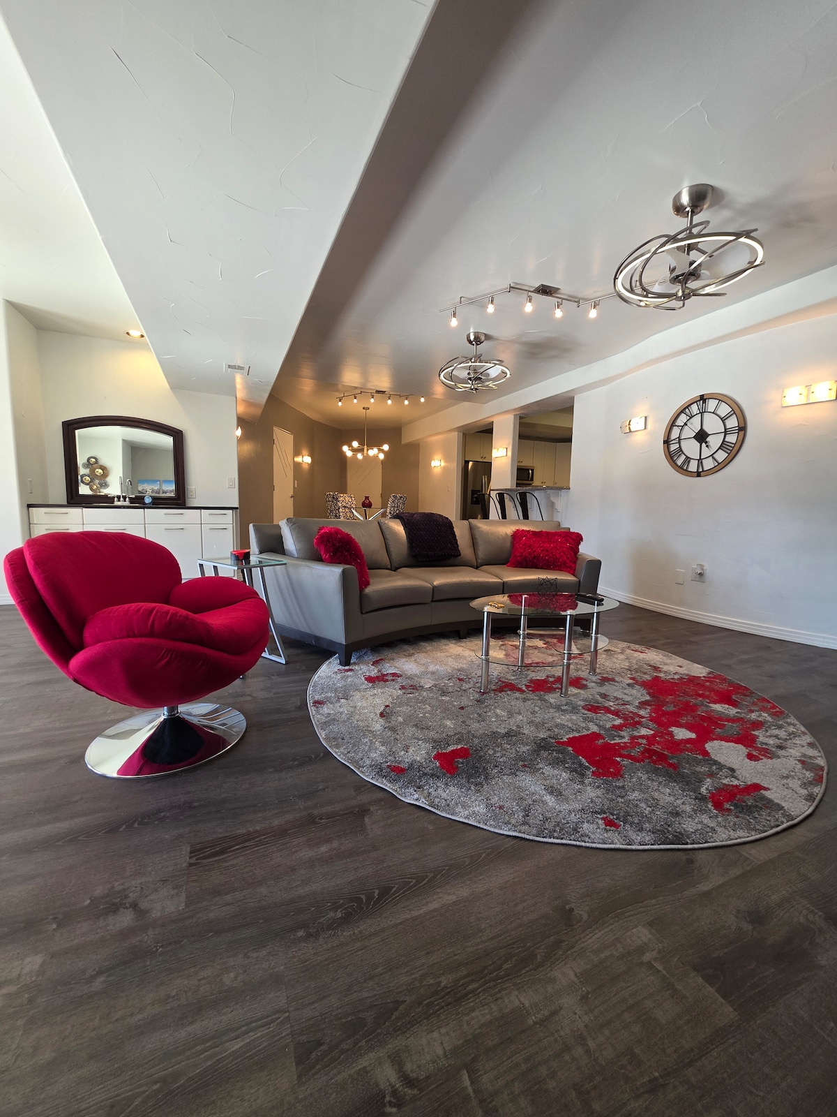 Appartement moderne d'une chambre construit en 2021. Situé dans le centre de Castle Rock. À distance de marche des restaurants, des événements, des sentiers pédestres et des parcs. Stationnement dans la rue disponible devant la propriété. AC. À l'intérieur se trouve une cuisine complète avec des produits essentiels, y compris du café, de la crème, une table à manger et des chaises. Buanderie complète avec 2 pods fournis. 1 chambre avec un lit queen size, télévision pour le streaming, cheminée électrique et dressing. La chambre principale dispose d'un canapé-lit queen size et d'un fauteuil inclinable. Salle de bain complète avec savons. Capacité d'hébergement de 4 personnes