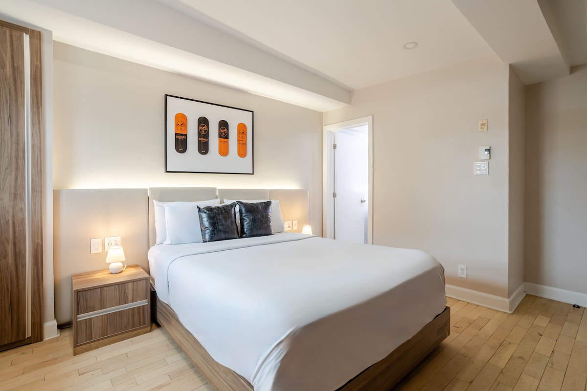 Cette élégante chambre d'hôtel allie style et confort, avec un lit queen size moelleux et des draps haut de gamme. Situé dans l'un des quartiers les plus animés de Montréal, vous êtes à quelques pas des cafés, des bars et des joyaux culturels. Les voyageurs ont également accès à un salon accueillant dans le hall et à un sous-sol spacieux avec des sièges confortables, une table de billard et une télévision à grand écran, parfaits pour le travail ou la détente.