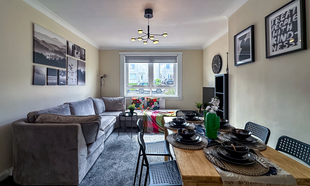 N.B. : Le prix que vous voyez est le prix que vous payez, selon les nouveaux frais de service d'Airbnb. De nombreux hôtes n'ont pas encore adopté les nouveaux frais ; veuillez donc garder cela à l'esprit lorsque vous comparez avec d'autres logements. Appartement d'une chambre au rez-de-chaussée, lumineux, moderne et spacieux, avec entrée sécurisée, parking privé gratuit en dehors de la rue, d'excellentes liaisons de transport et une connexion haut débit par fibre optique rapide. Une base idéale pour explorer de nombreuses attractions, à seulement six miles du centre-ville de Glasgow. L'aéroport de Glasgow est à 10 minutes par la route, en passant par le nouveau pont de Renfrew.
