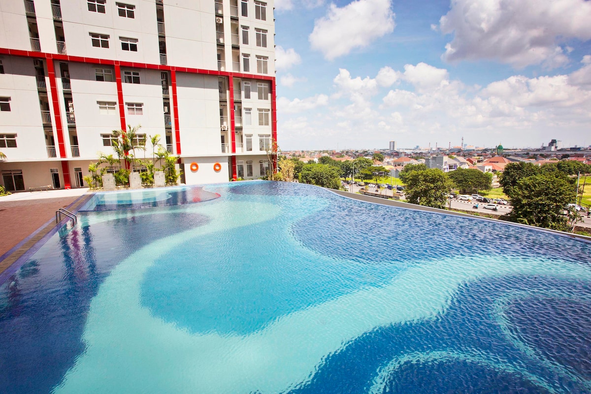 This unit with Balcony viewing City and beautiful Pool, is located at the 7th Floor Benson Pakuwon Mall, connect and direct access to the biggest mall in Indonesia, Great View Great Experience. Free Parking for 1 Spot Car Best stay for family of 5 - 6 people * 2 Bedrooms (2 Queen Bed, 1 Single Bed) * Living room with Big Sofa Bed Recline * 1 Bathroom +Water Heater * TV Wifi Netflix * Kitchen and dining table set * Dispenser Vegan Breakfast Box add cost 35K/pack No Liquor, NO Smoking