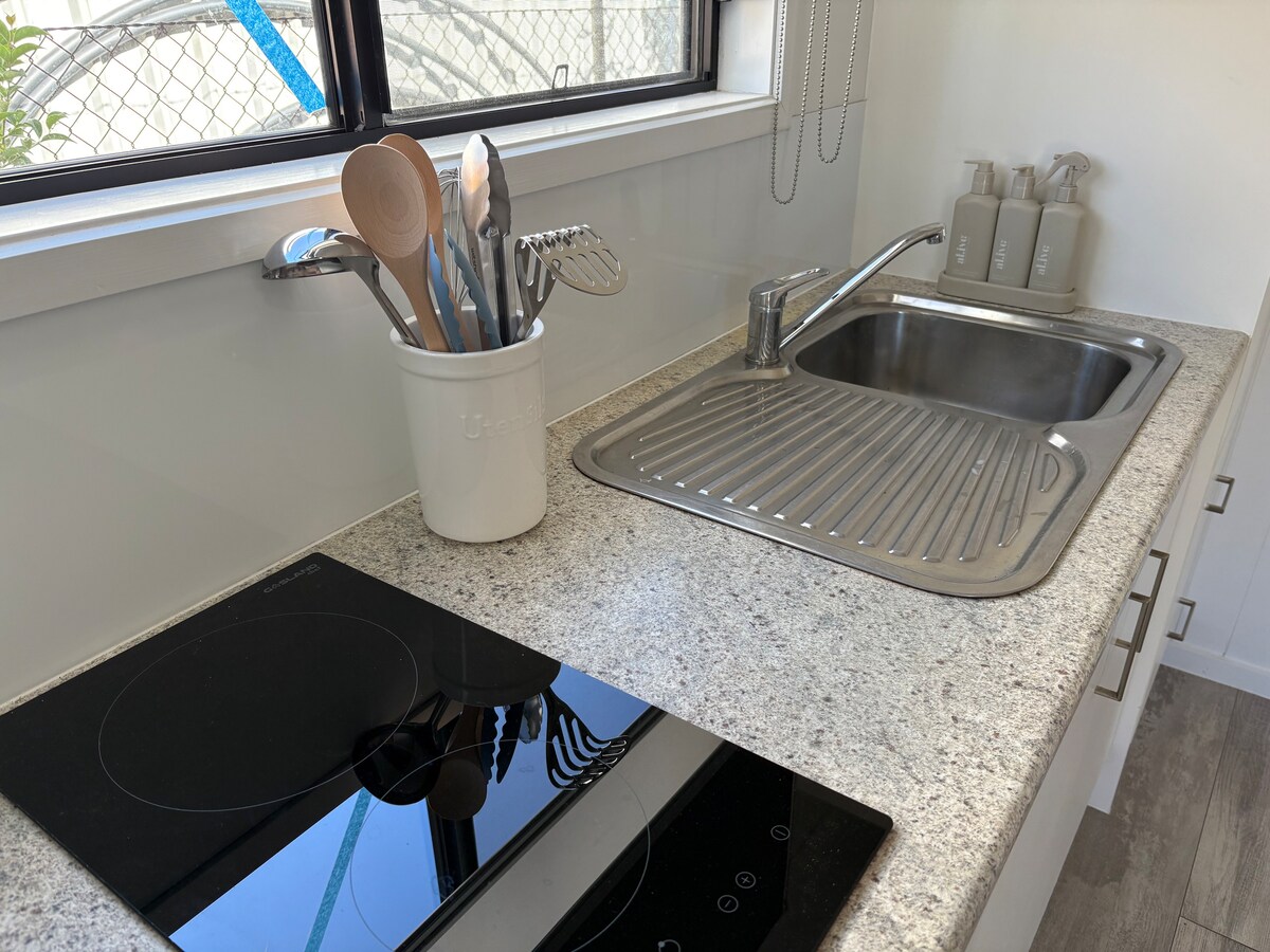 Tucked in native gardens, this architect-designed studio blends modern design with nature. Inside, enjoy a light-filled open-plan space with warm plywood walls, two bedrooms (queen and bunk bed), and a cozy loft. Outside, unwind in the expansive garden, surrounded by native plants, birdlife, or enjoy a walk through the neighbouring Dewhurst Reserve. Traveling with an EV? We offer on-site slow charging (10A) for a flat fee per night. Please let us know in advance for instructions.