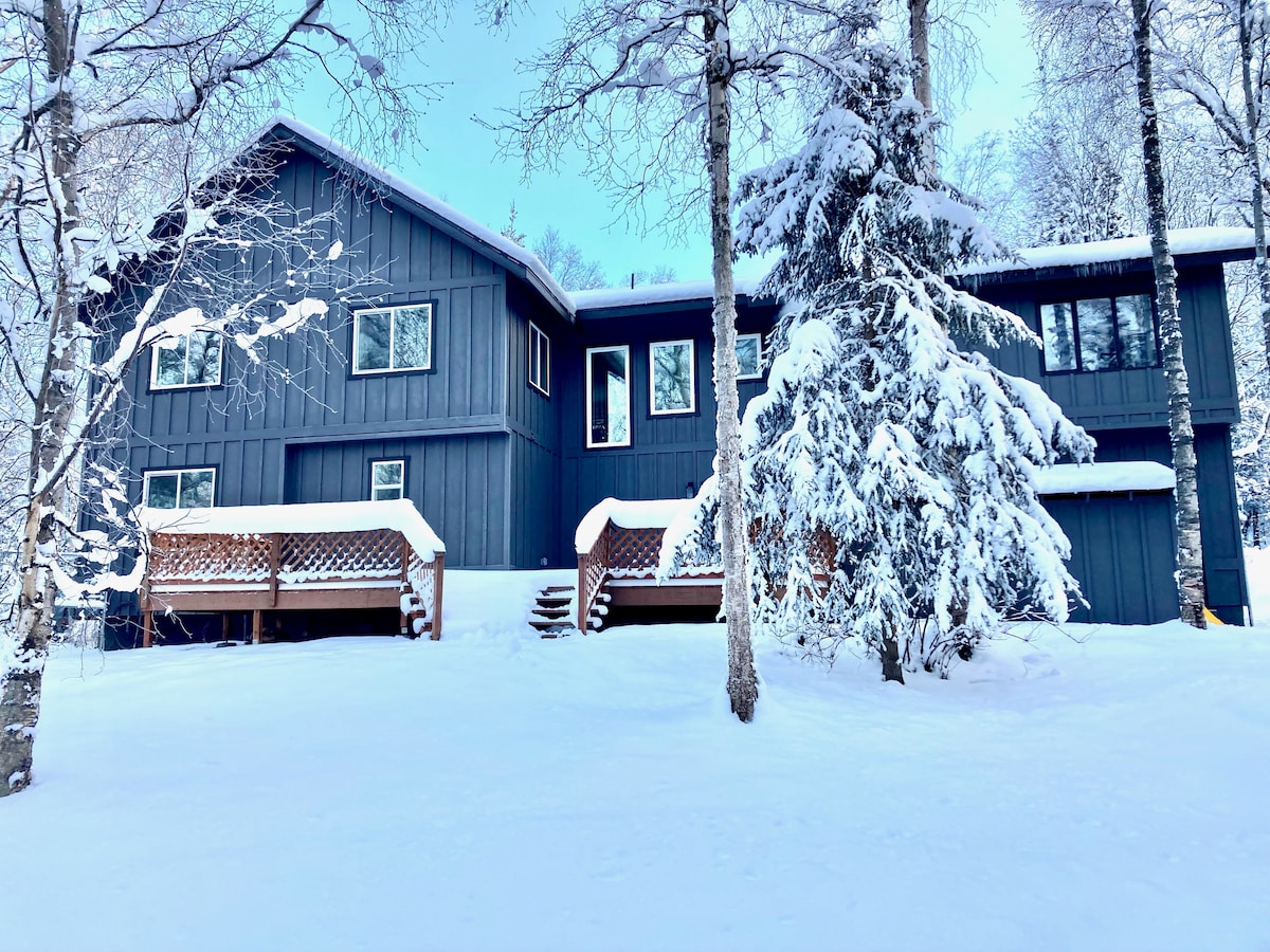 Évadez-vous dans une belle retraite en Alaska nichée sur une falaise surplombant les majestueuses montagnes Talkeetna. Cette propriété de 2 acres dispose d'une grande terrasse avec un jacuzzi pour 4 personnes et un foyer, parfait pour se détendre en fin de journée. Il y a deux chambres confortables, chacune équipée de sa propre télévision, et une salle de bain de type spa pour la détente. Il y a un lave-linge et un sèche-linge, donc vous aurez tout le confort d'un chez-soi. Situé à proximité de lieux de loisirs de plein air comme Hatcher Pass, cet endroit est idéal pour tout le monde.
