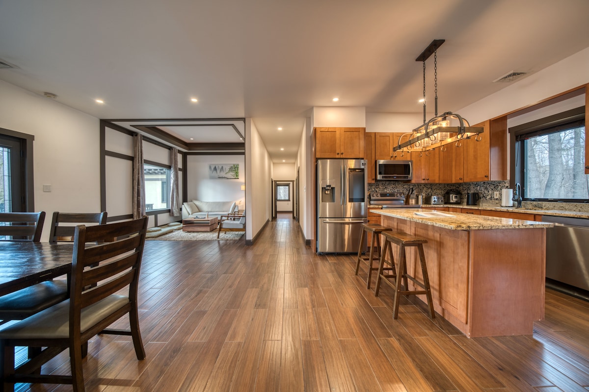 Découvrez le luxe et le confort de notre propriété nouvellement construite. Admirez la vue panoramique imprenable sur la montagne Rusk à travers les baies vitrées. Détendez-vous dans le sauna ou le jacuzzi et réunissez-vous autour du brasero pour des soirées confortables. Profitez de soirées cinéma en plein air avec notre projecteur, ou savourez des grillades dans le patio. Réchauffez-vous près de la cheminée, explorez les stations de ski, les clubs de golf et plus encore. C'est la retraite parfaite pour les familles et les amis. Réservez dès maintenant et créez des souvenirs inoubliables !