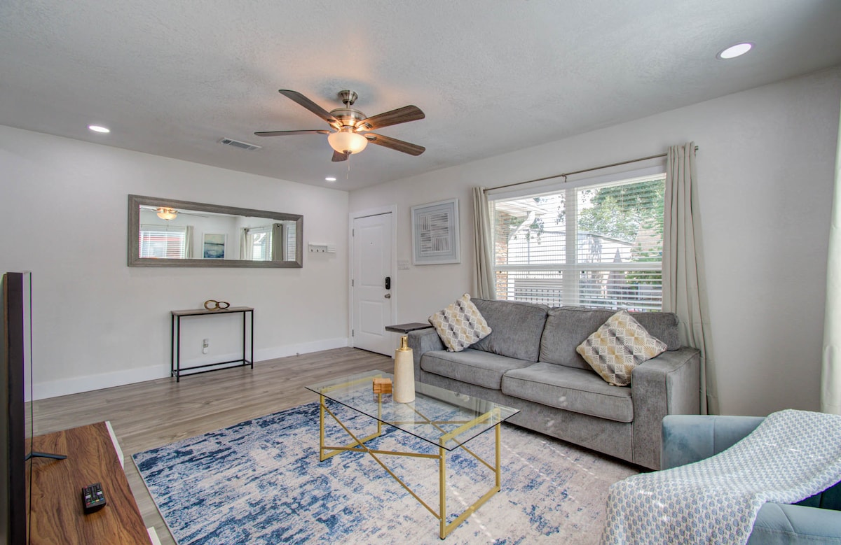 Élégant et branché, ce charmant ranch moderne de 2 chambres est situé à 2 pâtés de maisons de l'I-45, à 15-20 min du centre médical, à 15 min de Galleria, à 5 min du centre-ville, à 5 min de la région de Heights/White Oak Dr. Charge EV et bureau + moniteur incurvé de 27" avec HDMI vers USB-C. Entrez directement pour vous reposer et regarder la télévision, ou dormez dans la chambre principale avec un lit queen size moelleux, ou dans la chambre secondaire avec 2 lits jumeaux. Climatisation centrale, appareils électroménagers en acier inoxydable, barbecue, intérieur rénové, lave-vaisselle, lave-linge/sèche-linge et entièrement clôturé.
