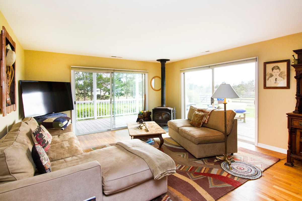 C'est la version new-yorkaise du Big Sur californien, avec un accès direct à la plage et des vues spectaculaires sur l'eau, entouré de forêt. Moderne, 3 000 pieds carrés. Descendez le chemin de la maison à une plage de sable fantastique avec sauveteur. Grande terrasse pour se prélasser, barbecue et vue sur le coucher du soleil. 4 chambres, 3 salles de bain, douche extérieure, jacuzzi pour 4 personnes, sauna pour 2 personnes, salon séparé avec home cinéma, salle de sport, hamacs, cheminée à bois. Découvrez le détroit de Long Island sans voisins ni banlieues ; un havre de naturaliste.