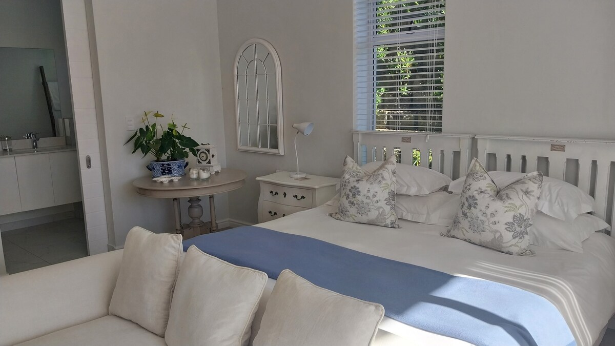 Nouvelle grande suite moderne lumineuse située dans le domaine privé sécurisé fermé de Kanonkop entouré de fynbos. Grandes portes coulissantes qui donnent sur la terrasse avec une vue sur le jardin et très privées. Kitchenette ouverte avec un canapé confortable pour se détendre ou regarder la télévision sur un écran intelligent. Lit Super King confortable avec linge de lit 100 % percale de coton. Grande salle de bain avec douche à effet pluie et lavabo pour lui et pour elle. À 5 minutes du centre de Knysna, de Knysna Waterfront et de Thesen Harbor Town. Wifi non plafonné. Simola et Pezula