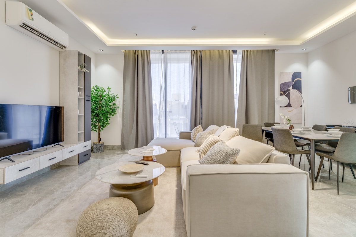 Appartement moderne et élégant d'une chambre à Al Malqa, à seulement 10 min du Boulevard Riyadh City, du Boulevard World & Kingdom Arena, et à 8 min du Solitaire Mall. Profitez d'un confort de niveau hôtel avec un salon confortable, un bar à café Nespresso, une cuisine équipée, une télévision connectée, un lit king size, un lit bébé, un lit pliable et une arrivée autonome. Collations et boissons gratuites, connexion Wi-Fi rapide, climatisation, parking privé et accès facile à l'arrêt de bus voisin reliant le métro de Riyad