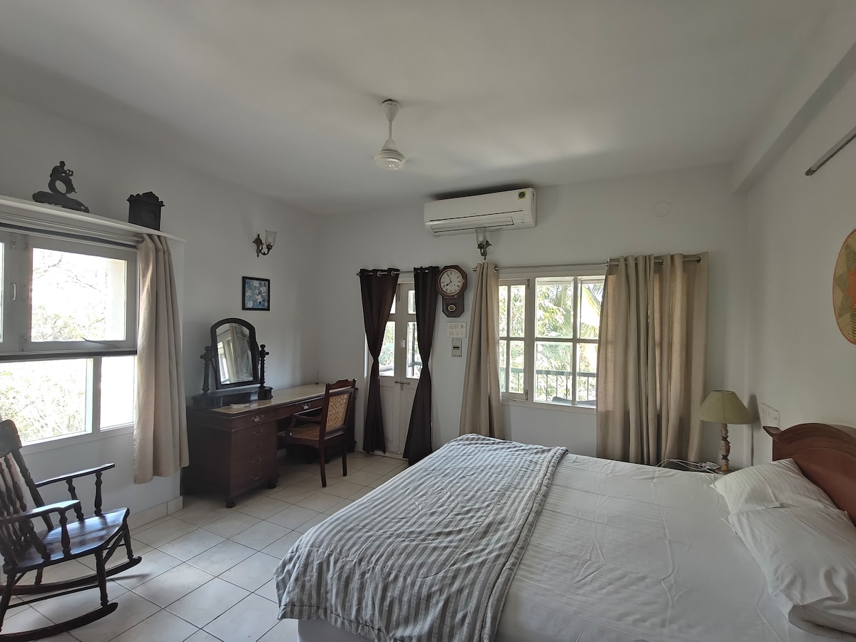 Une chambre calme et privée au deuxième étage (sans ascenseur), idéale pour un voyageur seul. La chambre dispose d'une salle de bain attenante, de la climatisation, d'un bureau dédié, d'un placard, d'un chauffage, d'une bouilloire et d'une excellente ventilation avec lumière naturelle. Le quartier est bien desservi et situé au centre, près du consulat américain, des temples Kapaleeshwarar et Parthasarathy, de l'avenue Express, du Citi Centre, de la plage de Santhome, du PVR (Sathyam) et de la gare de banlieue, tous à moins de 10 minutes.