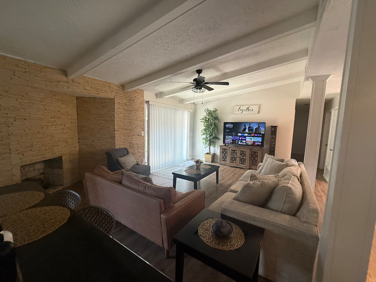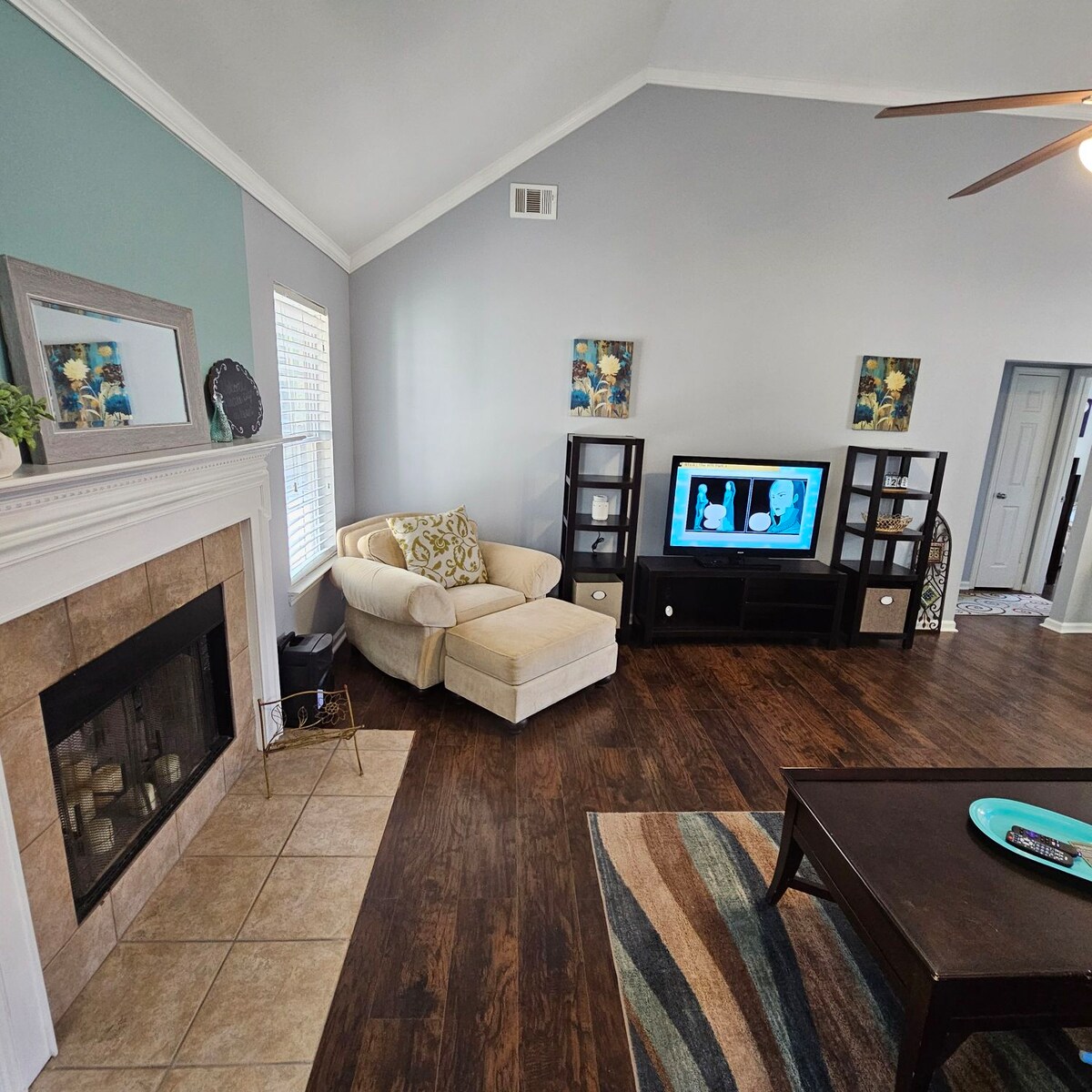 Bienvenue à Southern Oaks Retreat ! Notre maison récemment rénovée offre une salle de jeux/théâtre (TV 86", Nintendo, jeu de palets, baby-foot, fléchettes), un salon spacieux (TV 75"), un bureau avec fauteuil de massage et une chambre principale avec lit king size et salle de bains attenante. Le jardin dispose d'un putting green, d'un disc golf, d'un brasero, de lumières de bistro et de jeux de pelouse. YouTube TV, NFL Sunday Ticket, Netflix, Disney+, Hulu... à nos frais ! Meubles et appareils électroménagers neufs, cuisine approvisionnée, buanderie, plus golf, piscine, tennis et pickleball à quelques pas avec beaucoup de places de stationnement.