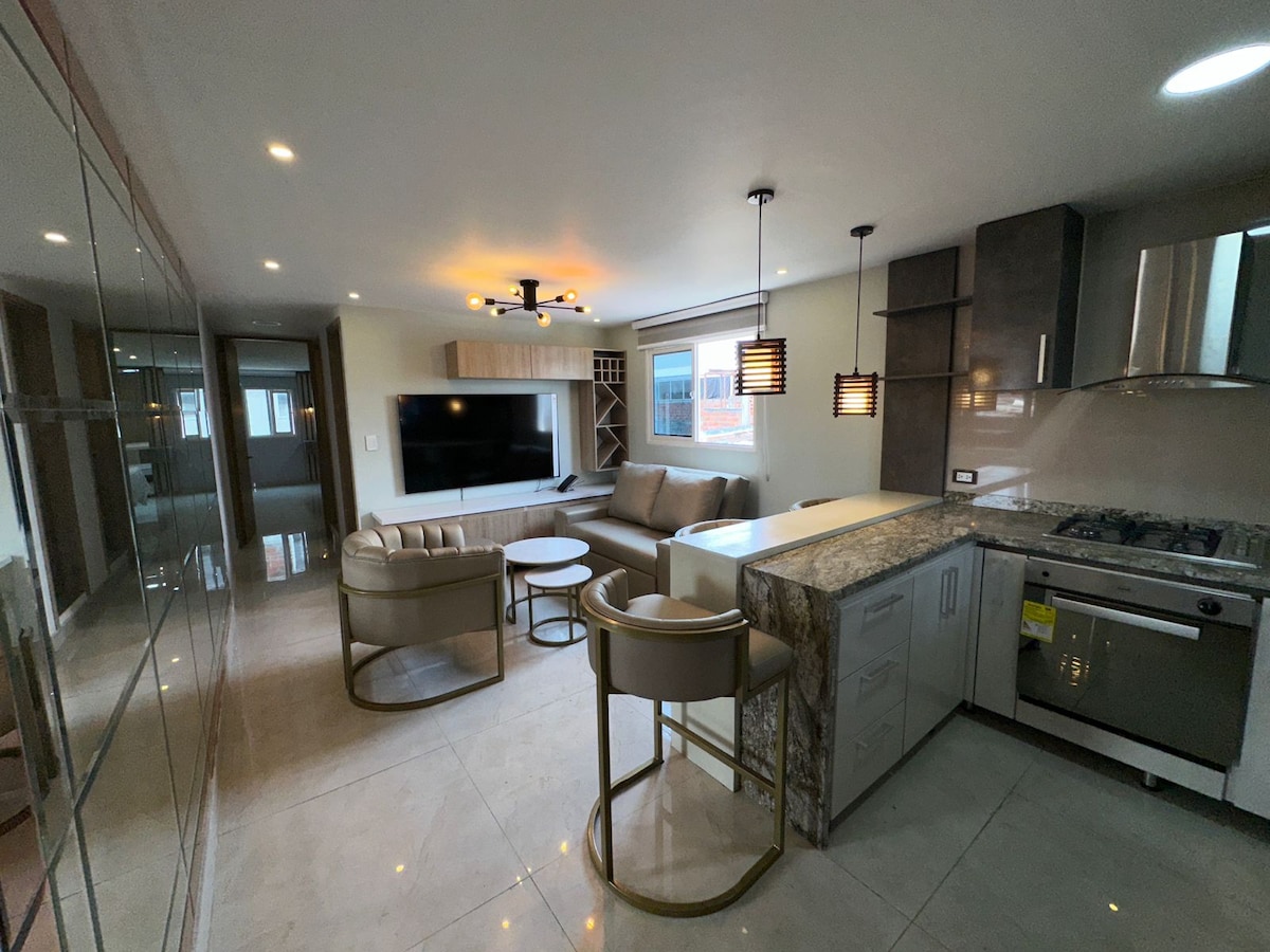 Profitez d'un séjour élégant dans cet appartement moderne, conçu pour vous offrir confort, élégance et fonctionnalité dans les moindres détails. L'espace dispose d'un salon moderne avec Smart TV, d'un bureau ergonomique idéal pour travailler ou étudier, et d'une décoration avec des touches chaleureuses qui vous feront vous sentir comme chez vous. La cuisine est entièrement équipée et dans la zone de lavage, nous avons un lave-linge/sèche-linge. Avec un accès facile aux restaurants, centres commerciaux et routes principales.