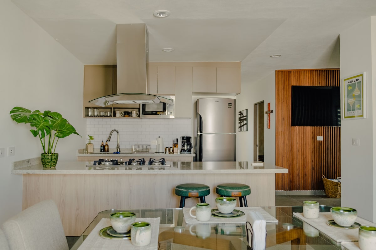 💵 Facturation disponible. 💵 🌿Refuge avec style à Querétaro🌿 🛏️ 2 chambres | 2 salles de bains. ⭐Chambre principale Lit King salle de bain privée. ✨Deuxième chambre : lit Queen 👶 Lit de bébé disponible sur demande Espaces communs 🎥 Salle de télévision : Écran de 65" avec accès au streaming. 🍳 Cuisine : Entièrement équipée pour votre confort 🌿 Cour arrière : Calme et confortable, idéal pour se relaxer Aménagements 🏊 Piscine 💪 Salle de sport 🏀 Terrain de basket 🎡 Aire de jeux pour enfants ✨ Cosmos Homes Quality.