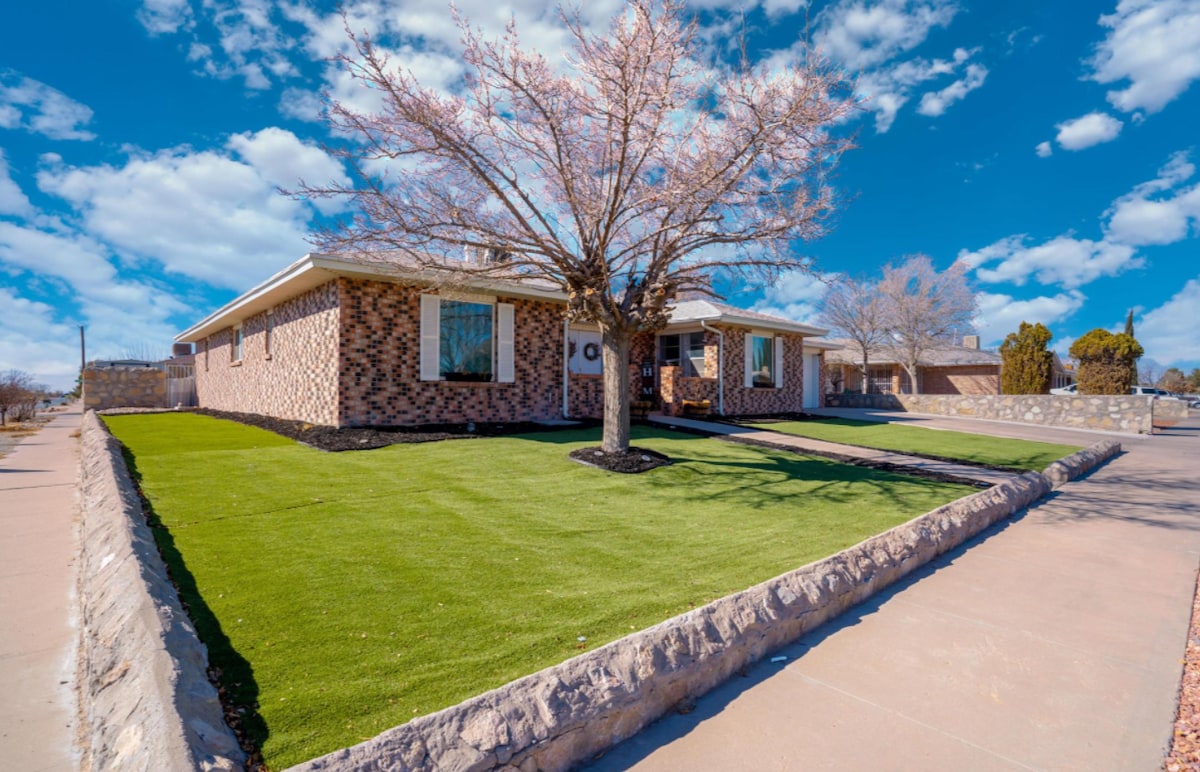 Découvrez la culture mexicaine-américaine vibrante et son hospitalité chaleureuse dans cette maison ouverte et rénovée. Que vous soyez en ville pour travailler, vous détendre ou jouer, cette spacieuse maison de 3 chambres/2 salles de bain avec salle de jeux, plus de 500 Mbps, climatisation réfrigérée, suite parentale et cuisine gastronomique a tout pour plaire. Détendez-vous près de la table de feu ou de la pergola hamac dans la NOUVELLE retraite de jardin avec terrain de basket et pickleball ! Proche de l'I-10, de l'aéroport, de l'UTEP/UMC/du centre-ville/de FtBliss/de HuecoTanks/des restaurants/des parcs/des magasins. Au plaisir de vous accueillir. ¡Bienvenidos!
