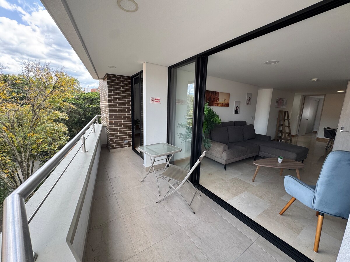 Élégant appartement de 104 m² avec vue panoramique sur Medellín. Elle comprend deux chambres avec lits king-size et salles de bains privatives, une salle de bains pour les invités, la climatisation et une grande terrasse privée.L'immeuble propose une piscine à débordement, un espace de coworking, une salle de sport et une cuisine entièrement équipée pour des expériences gastronomiques.Situé à seulement 9 minutes d'El Poblado, de Provenza et de Parque Lleras. ✨ Un espace où le design rencontre le confort, et Medellín devient votre scène privée.