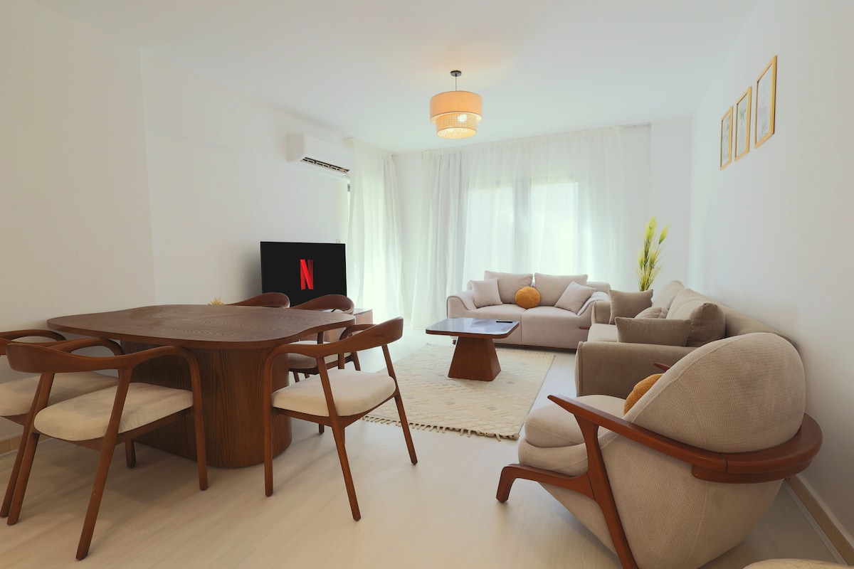 Élégant appartement bohème de 2 chambres dans un endroit calme et reposant surplombant un grand jardin – parfait pour un séjour paisible et confortable. Profitez de 3 téléviseurs connectés : deux écrans de 65 pouces (dans le salon et la chambre principale) et un téléviseur de 50 pouces dans la deuxième chambre — tous avec des services de streaming inclus. En plus, une connexion Wi-Fi ultra-rapide et fiable, idéale pour le télétravail ou les soirées cinéma. Emplacement privilégié à quelques minutes seulement du centre commercial Gateway Mall, avec des cafés, des restaurants et des boutiques à proximité, dans le quartier d'El Rehab au Nouveau Caire.