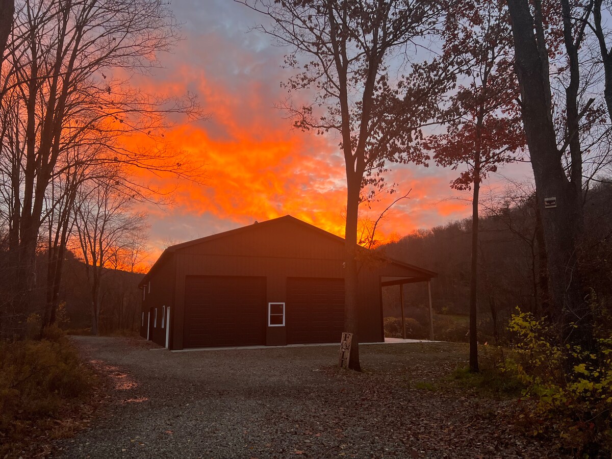 Idéalement situé. Cet espace est une nouvelle construction de 40 par 32 sur deux étages. Comprend 3 chambres : 3q, 2f, 1t. Une salle de bain avec douche carrelée. Plan d'étage ouvert avec cuisine complète, salon, salle à manger mise en valeur par un bar en béton de 16 pieds et des plafonds de 16 pieds de haut. Buanderie avec lave-linge et sèche-linge. Foyer extérieur avec bois de chauffage fourni. Télévision intelligente de 60 pouces - WiFi - Chauffage par le sol. Arrivée autonome. Holiday Valley 6,9 mi, Seneca Allegany casino 8,1 mi. Ellicottville 7,9 mi Allegany State Park 12 mi