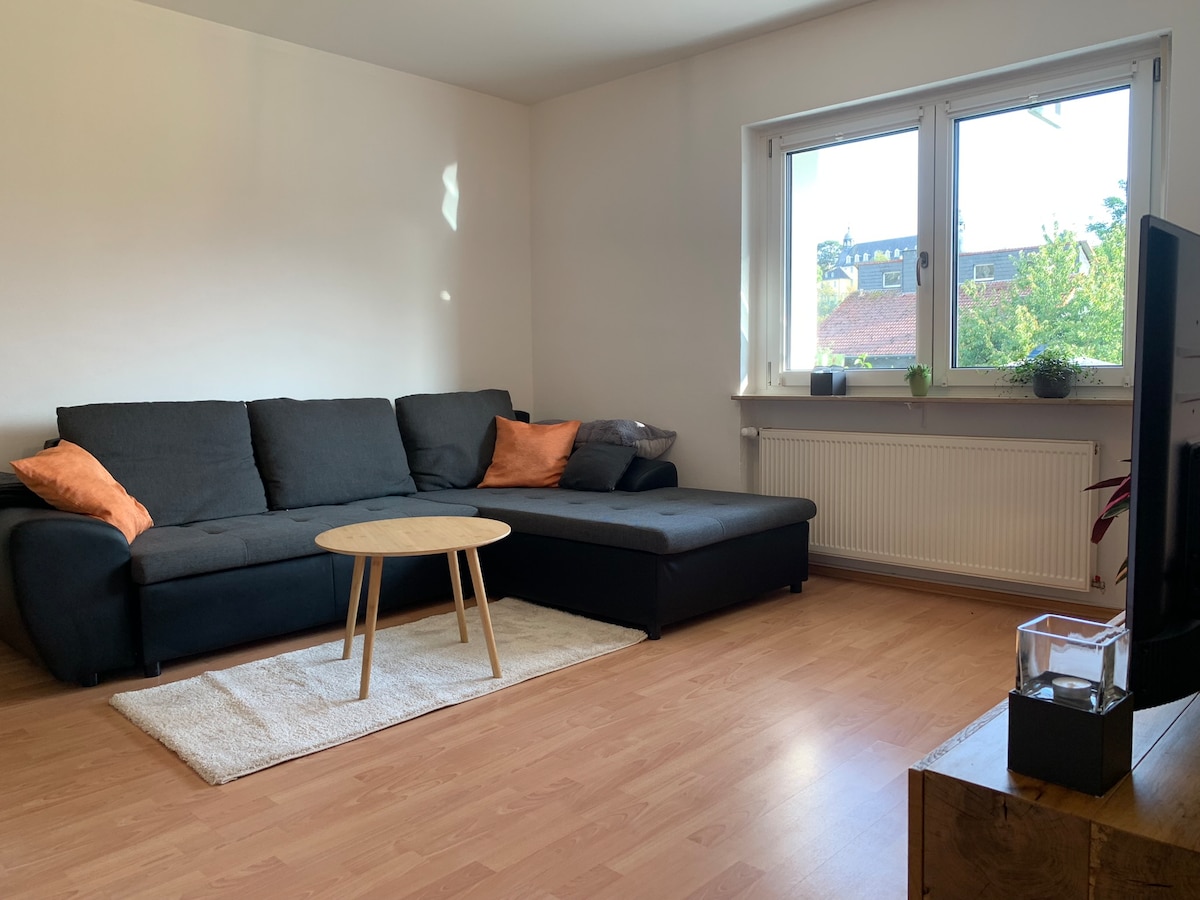 Bienvenue dans mon appartement confortable. Avec un café ou un thé, vous commencez la journée et détendez-vous le soir devant la télévision dans le salon confortable. Vous disposez d'un lit de 1,6mx2m dans la chambre séparée. Vous trouverez une connexion Wi-Fi, un fer à repasser, un sèche-cheveux, des ustensiles de cuisine, etc. Un lit de voyage pour enfants avec un matelas de haute qualité est à votre disposition.