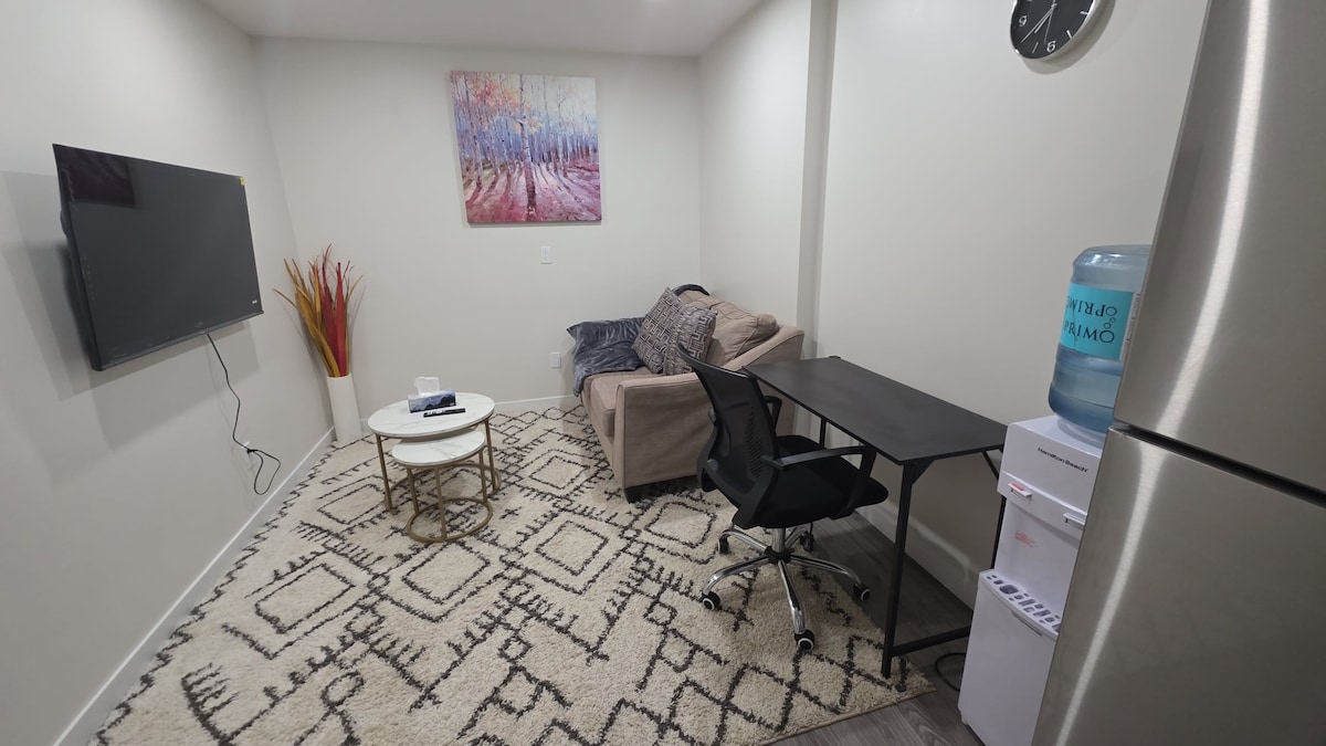 Une nouvelle suite au sous-sol. Confortable, paisible et un endroit qui vous fait vous sentir comme chez vous, loin de chez vous. Il est équipé d'un coin salon où vous pourrez vous détendre et regarder les programmes de votre choix, d'une cuisine qui vous permet de préparer des repas rapides, d'une chambre confortable avec un lit Queen Size pour deux personnes et d'une salle de bains complète. Poste de travail pliable au cas où vous auriez besoin de travailler sur votre ordinateur portable. Vous avez également un joli jardin où vous pourrez vous détendre comme à la maison.