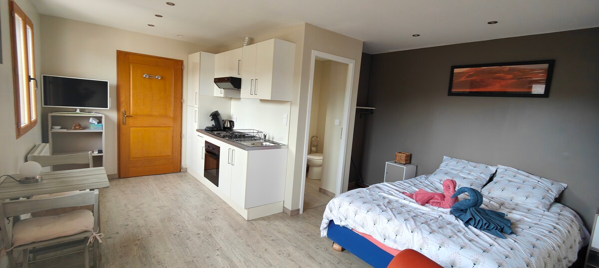 Studio tout confort dans maison indépendante en pleine nature avec vue exceptionnelle. Grande terrasse panoramique, double exposition. Accès direct à un parc arboré d'un hectare au calme, idéal pour se ressourcer, lire, méditer... Nombreuses activités à quelques minutes de voiture (marché, musée du chocolat, mastrou, dolce via) Possibilité de s'approvisionner directement sur place chez les producteurs (fruits et légumes, fromages) Repas et petit déjeuner à base de produits locaux (en sus)
