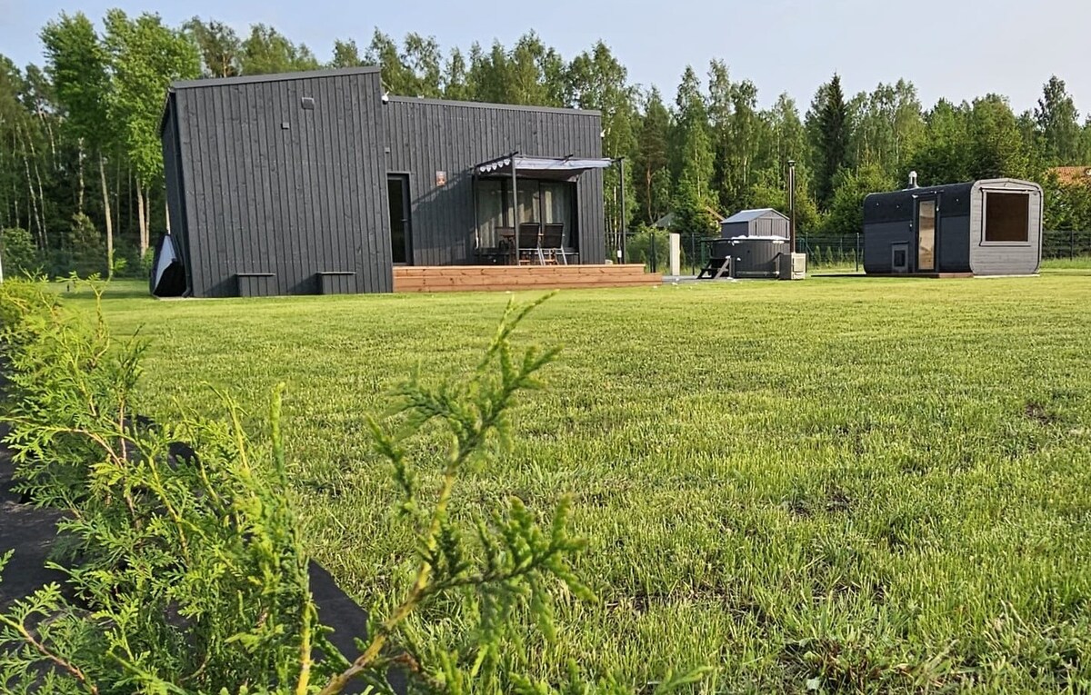 Le chalet est neuf, moderne, adapté pour profiter du silence et de la nature. Endroit idéal pour se reposer et de relaxation. Les voyageurs ont accès à un jardin privé, une terrasse, un barbecue. La maison dispose d'une cuisine entièrement équipée avec diverses options de cuisson, un lave-vaisselle, un réfrigérateur, une machine à café, une bouilloire, un grille-pain. Moyennant des frais supplémentaires, vous pourrez profiter d'un sauna et d'un jacuzzi. Une télévision et une connexion Wi-Fi gratuite sont disponibles pour le divertissement. Parking privé gratuit dans la cour. Le logement est à seulement 600 m de la plage.
