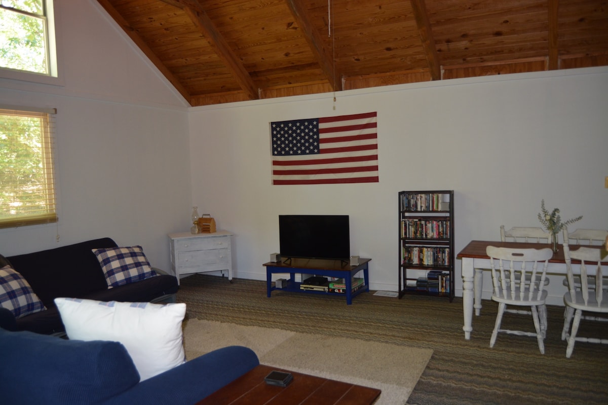 Magnifique chalet récemment rénové entouré de bois, à quelques pas d'un lac privé. Il est facile de s'isoler dans ce studio spacieux avec plafond voûté et ventilateurs, cuisine entièrement équipée, lit Queen Size et canapé-futon. Grande douche. Wi-Fi haut débit et Roku TV. Porche avec sièges ; barbecue au charbon de bois et foyer. Résidence des propriétaires sur la propriété, plus chiens et poules. À 7 miles d'Oxford Square, à 8 miles du campus.