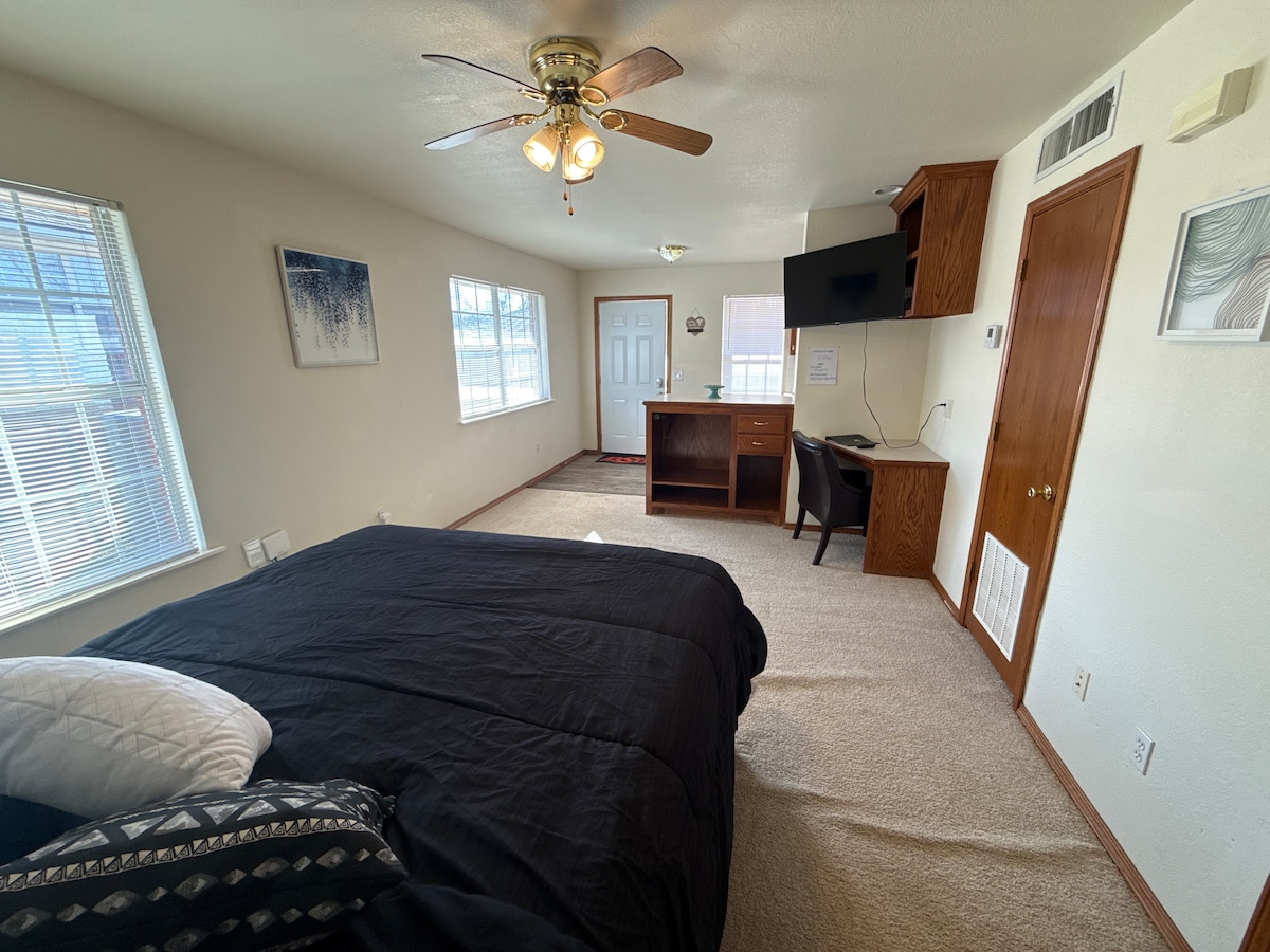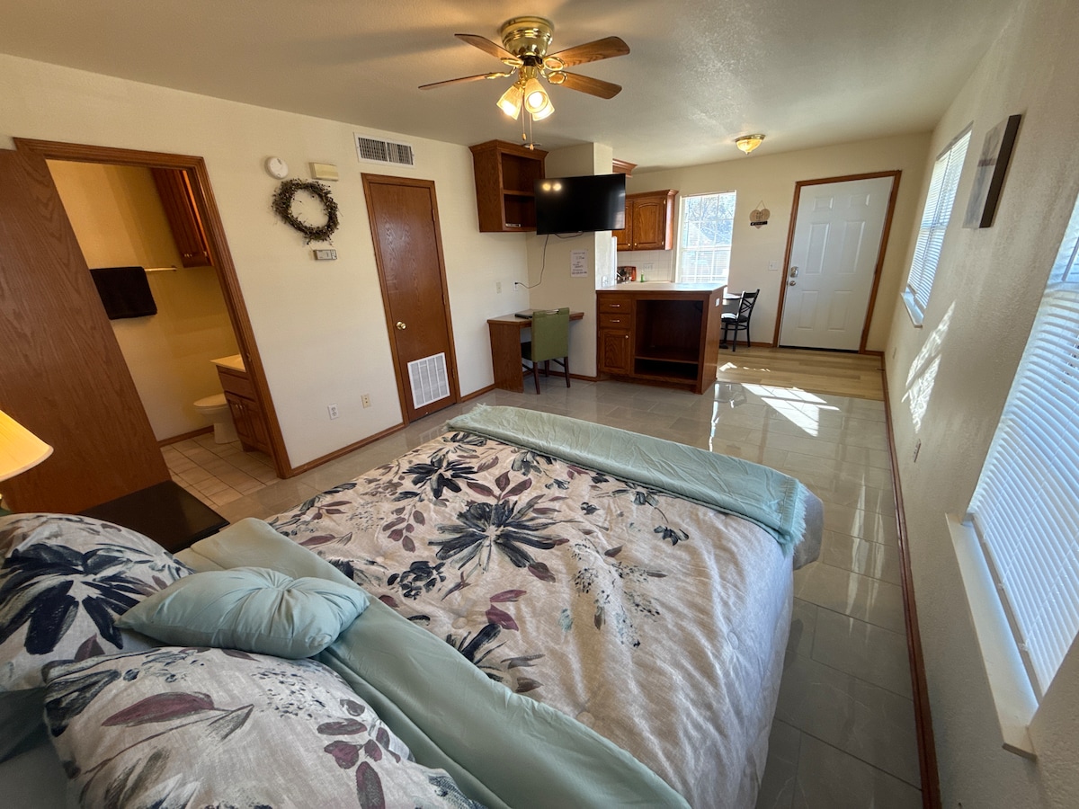 Cet appartement d'une chambre et une salle de bain sur S. Main Street à Stillwater fait partie d'un petit complexe de 12 appartements. Il est décoré en orange et noir pour vous aider à entrer dans l'esprit OSU ! La chambre dispose d'un lit Queen Size et le séjour dispose de deux futons. Vous pouvez facilement accueillir 4 personnes confortablement. La cuisine et la salle de bain sont équipées de tout pour que vous vous sentiez chez vous. Il dispose d'une porte extérieure au premier étage juste devant le parking.