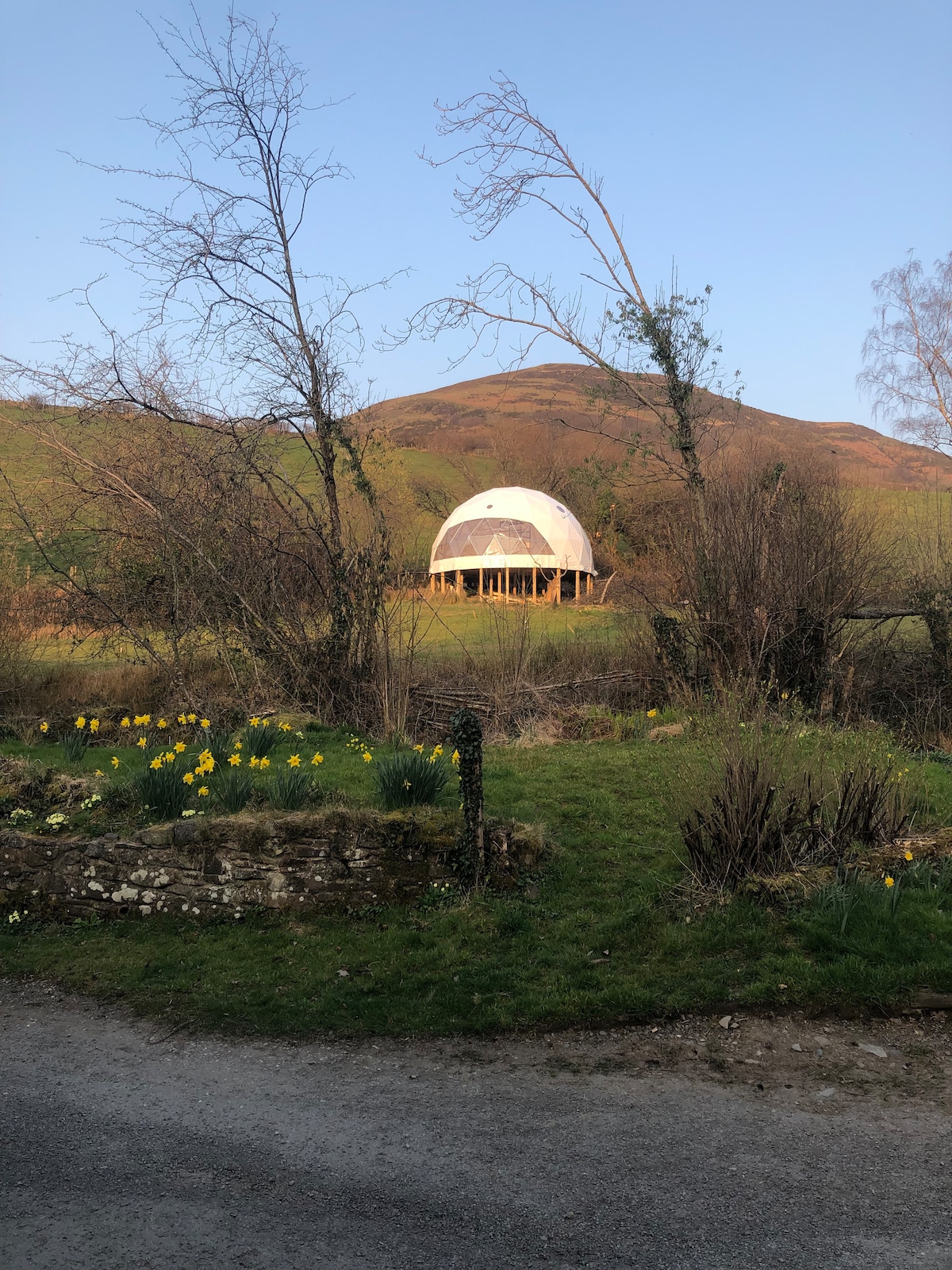 Situé dans un verger privé de fleurs sauvages d'une ancienne ferme galloise, ce dôme luxueux est entouré de faune quelle que soit la période de l'année. Fenêtre panoramique donnant sur la vallée boisée, poêle à bois, télévision intelligente, lave-vaisselle, salle de bains privative, four à pizza, barbecue, bain à remous au feu de bois, Wi-Fi, sièges et repas à l'extérieur. Peut également être réservé avec la propriété numéro 5890788 si vous faites la fête avec un plus grand groupe. Proche des montagnes de Snowdonia et à 35 minutes de la plage.