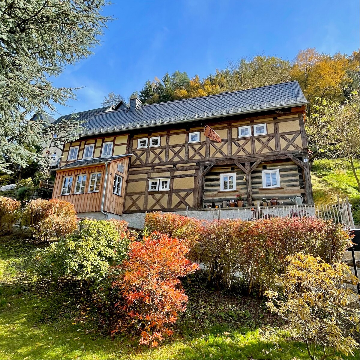 Bienvenue dans les Ore Mountains, tout d'abord une remarque importante : en hiver (dans la neige et la glace), la maison n'est accessible qu'avec des véhicules à quatre roues motrices. La maison est située en bordure du village, à environ 150 mètres au-dessus de la route principale au bout d'un chemin de terre escarpé, où il n'y a pas de circulation et où vous avez une tranquillité absolue. La grande prairie naturelle est également disponible pour les voyageurs. L'appartement bénéficie d'une entrée indépendante et de deux chambres accessibles séparément. Détails dans la description ci-dessous.