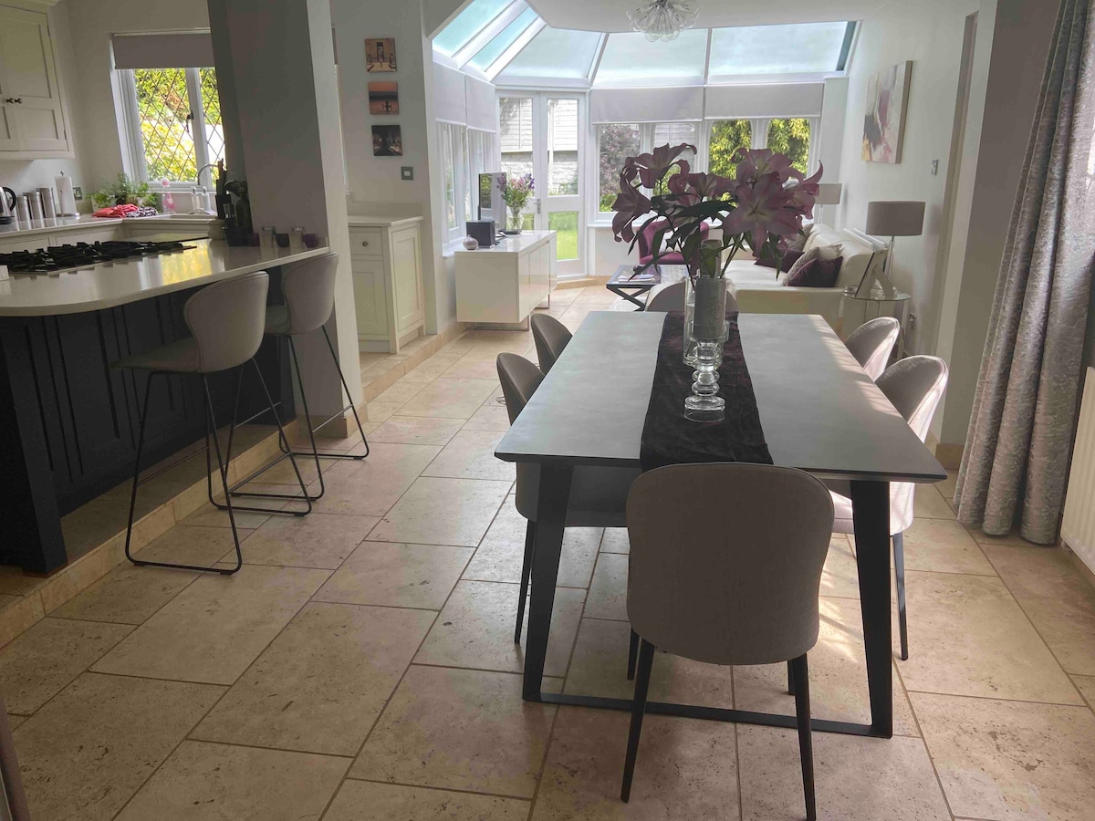 Maison jumelée lumineuse et paisible de 3 chambres près de Hampton Court. Séjour ouvert, cuisine entièrement équipée avec double four, télévision 65" avec système audio Sonos, Wi-Fi rapide et parking gratuit dans la rue sans restrictions. Idéal pour familles ou professionnels. Une maison confortable et habitée avec de l'espace pour se détendre, se divertir ou se relaxer pendant mon absence. Près de la rivière, du palais de Hampton Court, des restaurants, des pubs et des commodités locales. Propre, minimaliste et accueillant.