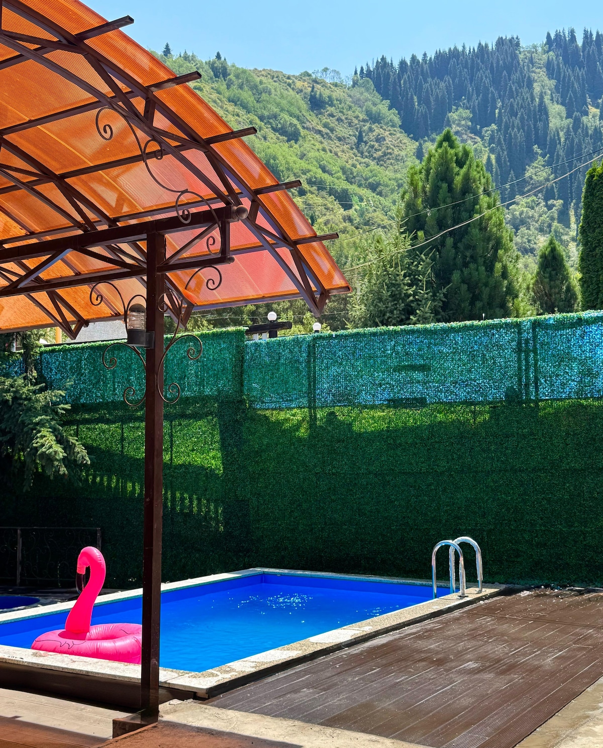 Talgar Villa - la villa de vacances parfaite • Panorama, piscine, sauna Talgar Villa est un endroit unique sur une colline avec vue panoramique sur les montagnes et les lumières de Talgar et Almaty. Le terrain de 3 hectares offre silence, air frais et intimité. Les voyageurs trouveront trois bâtiments : une maison de spa avec des vitraux pouvant accueillir jusqu'à 10 personnes, un sauna avec un salon, deux maisons d'hôtes et une piscine extérieure surplombant les montagnes et la ville. Parfait pour se détendre en famille, entre amis, pour des retraites de yoga ou des événements intimes en harmonie avec la nature.