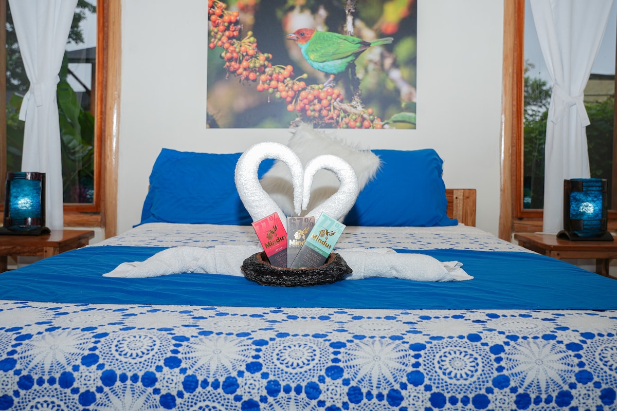 La maison Luli Wasi, située au cœur de la forêt nuageuse, offre une vue panoramique sur les montagnes et un accès à la rivière. C'est l'endroit idéal pour l'observation des oiseaux tels que les toucans, les colibris et les quetzales. Avec hydromassage, douche chaude, Wifi Starlink haute vitesse et Smart TV, il offre confort et tranquillité. Il dispose d'un bureau pour travailler et de deux balcons avec des aires de repos. À seulement 500 m de la Cascade du Rio Bravo, il est idéal de profiter d'activités d'aventure à proximité.