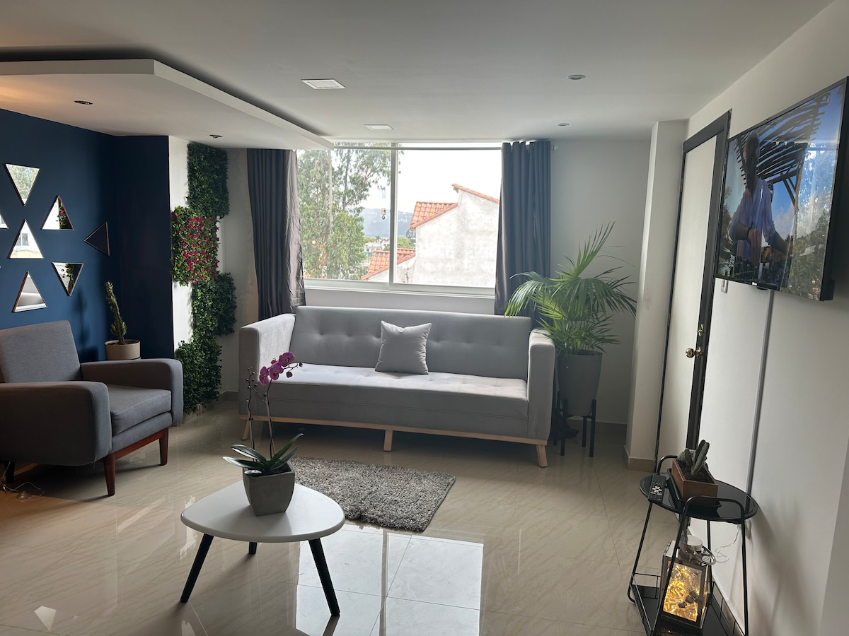 Cet endroit est unique et a son propre style minimaliste, il dispose d'espaces de luxe, si vous souhaitez passer une nuit romantique avec votre partenaire, nous avons un jacuzzi privé, une grande vue dans les différents environnements, lit queen, espace barbecue privé, cheminée avec équipement audio Bluetooth, Internet Netlife, télévision 65 pouces et Netflix, laveuse-sécheuse privée LG Smart, rideaux électriques, accès électronique sécurisé, situé dans l'un des meilleurs secteurs de Quito, les fêtes et les animaux de compagnie ne sont pas autorisés