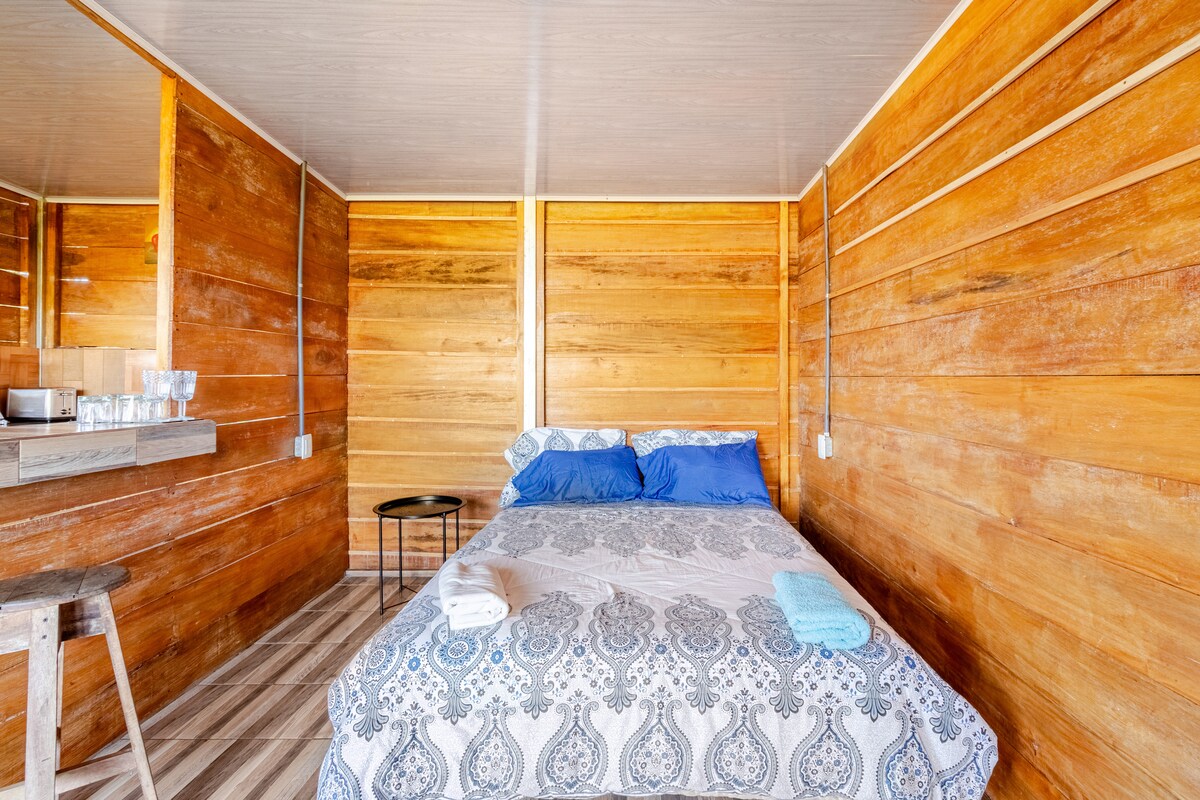 Dans notre cabane Safari, vous disposerez de tout ce dont vous avez besoin pour vous déconnecter et vous détendre. Profitez d'un espace entièrement meublé avec une salle de bain privée, une chambre confortable et une cuisine complète pour que vous puissiez vous sentir comme chez vous. Ici, vous pourrez vous immerger dans la nature, entouré d'une vue imprenable sur la montagne et de couchers de soleil impressionnants.