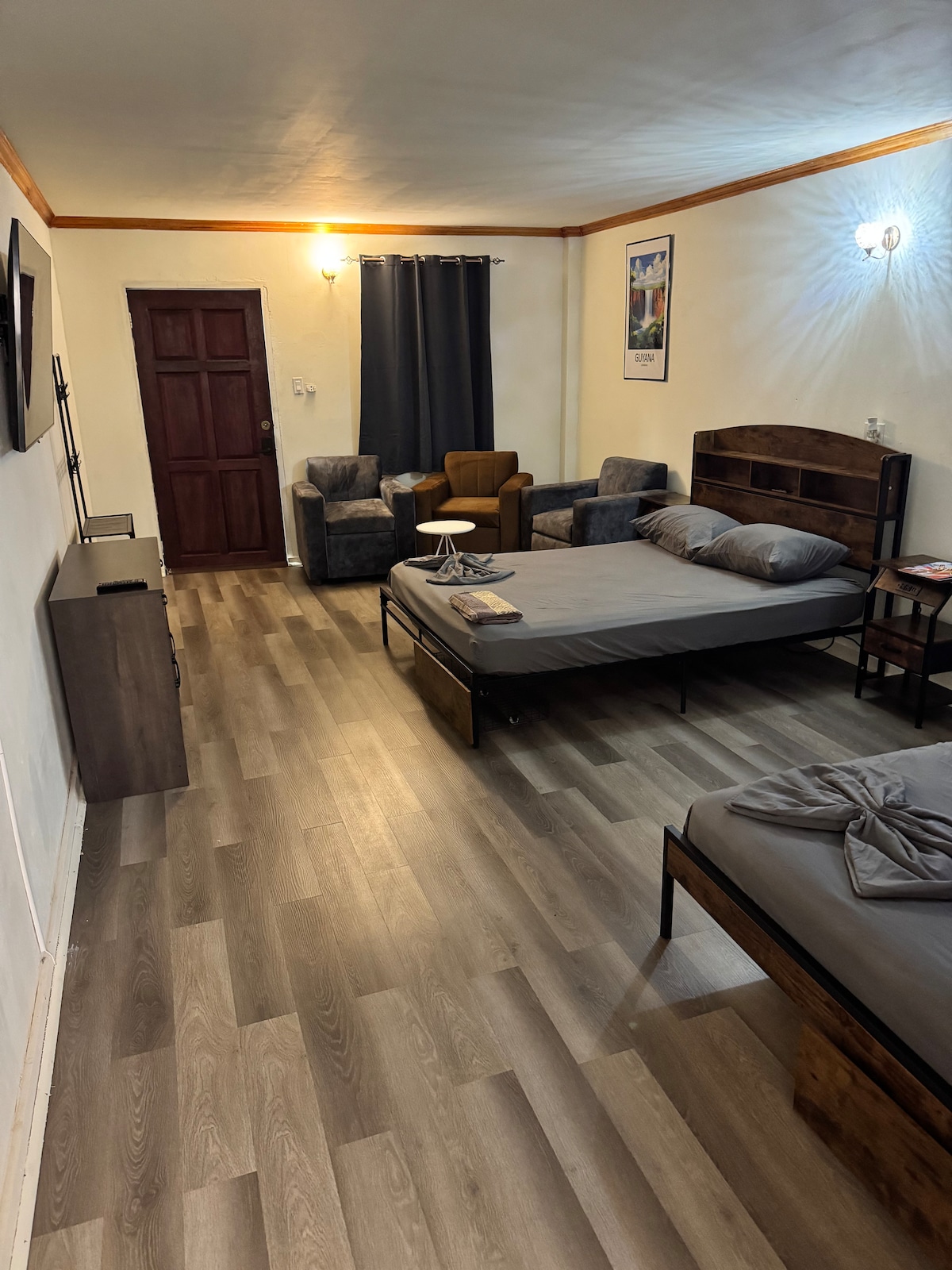 Bienvenue chez vous loin de chez vous ! Cette suite spacieuse et élégante de 2 chambres et 2 salles de bain offre le mélange parfait de décoration moderne, de confort et d'intimité, idéale pour les familles, les couples ou les voyageurs d'affaires. Niché dans un quartier paisible à Herstelling sur la rive est. Nous sommes situés à seulement 10 minutes du stade Providence et à 20 minutes de Georgetown, ce qui facilite l'exploration, la participation à des événements ou les déplacements pour le travail. La suite dispose également d'une terrasse privée, d'un bar sur place et d'un parking sécurisé.