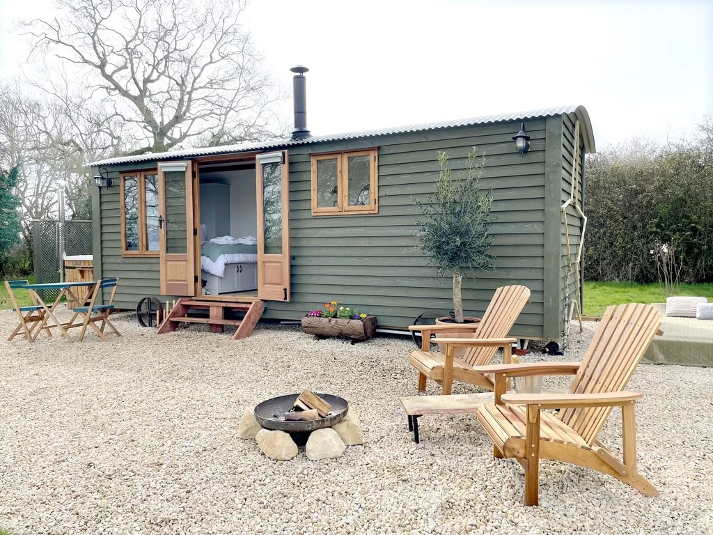 Vous adorerez cette escapade romantique dans une cabane de berger de luxe. Avec un poêle à bois confortable, un chauffage au sol pour quand vous avez besoin de confort supplémentaire, et un lit king size, une cuisine et une douche double à effet pluie. Vous trouverez une sélection de jeux de société. À l'extérieur, vous avez votre propre jacuzzi privé au feu de bois et un barbecue avec vue sur la campagne, tandis que la nuit, vous pouvez contempler les étoiles sur votre lit d'observation des étoiles, qui fait également un superbe lit pour attraper ces rayons. 💚