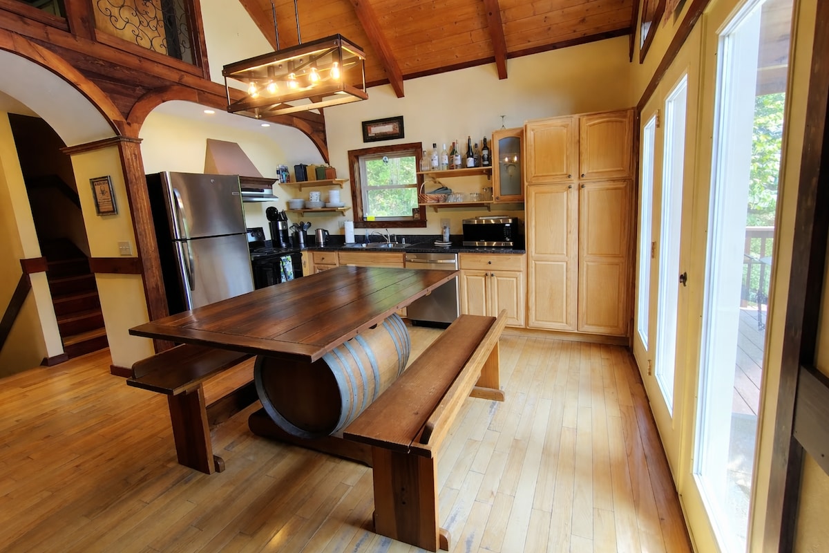 Sortez des sentiers battus dans ce logement unique et tranquille. Située au sommet d'une petite colline sur une crête traversée par une route sans issue, la cabane de 510 pieds carrés se trouve sur un terrain boisé. Idéal pour les couples, il s'agit d'une chambre avec terrasse, grand porche avant et une salle de télévision avec futon. Elle dispose d'un coin cuisine bien aménagé avec de nouveaux appareils électroménagers, des lambris en cerisier et en pin languette et rainure partout, un plafond voûté, un plancher en chêne massif, de grandes baies vitrées et un espace télévision/travail.