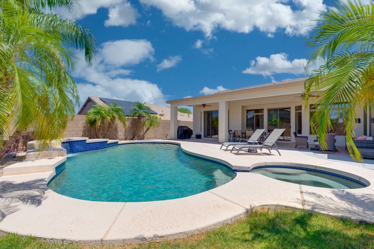 Escapade Goodyear : piscine chauffée, soirées pizza et billard ! 5 chambres/3,5 salles de bain, 12 couchages ! 🔥 Piscine chauffée en option (90 $/nuit, 2 nuits minimum, préavis de 48 heures). ⛳ Green de putting, 🍕 four à pizza au feu de bois, 🔥 brasero à gaz, 🥞 grill Blackstone, 🎱 table de billard, 🌧️ douche à effet de pluie de luxe. À 8 min de Spring Training, à 20 min de Westgate. Pas d'animaux de compagnie/fêtes. Arrivée à 16h00 : vos vacances commencent MAINTENANT !