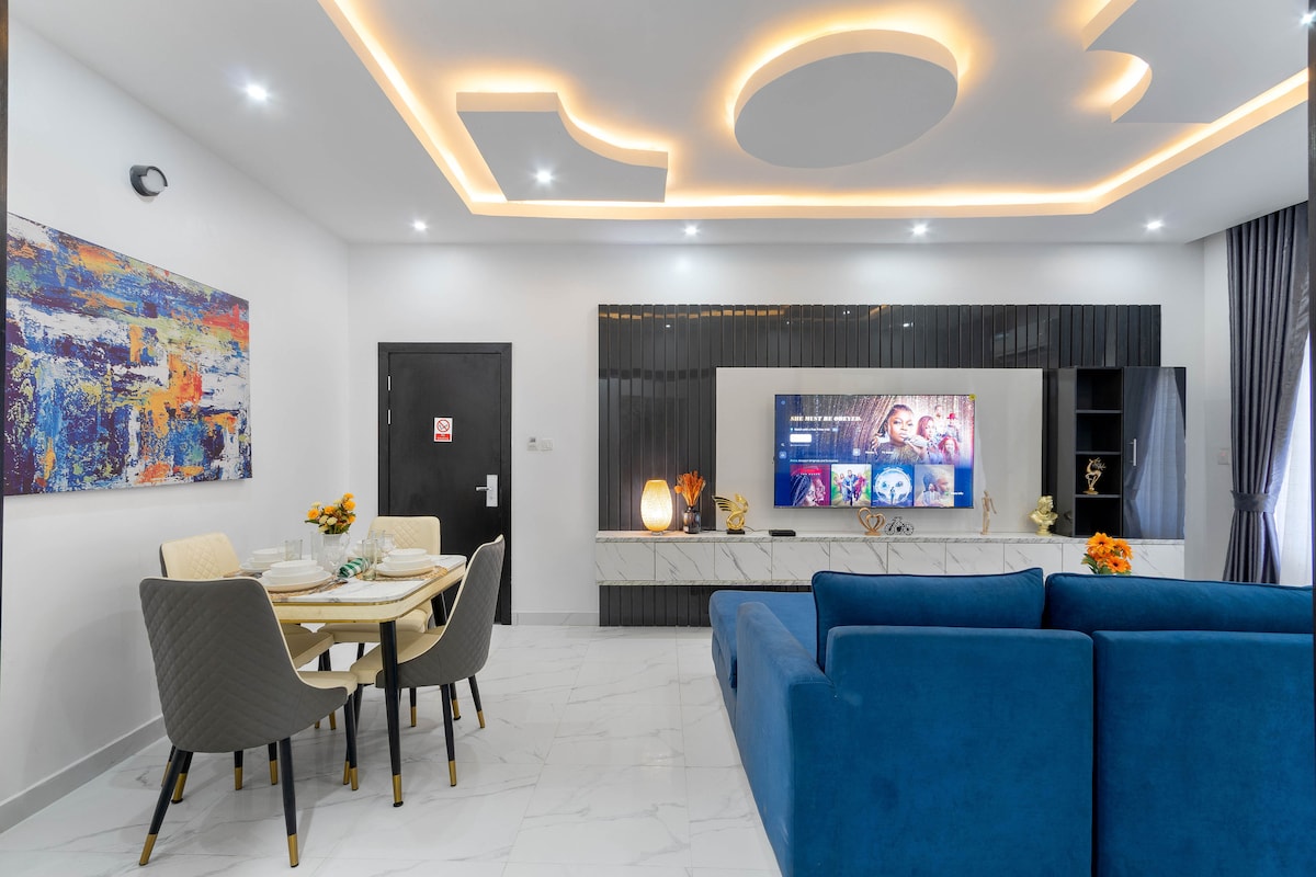 Bienvenue à Elmstead Luxury Aprt, votre retraite élégante à Lekki Ikota. Ce havre de paix de 2 chambres/2 salles de bain offre le confort de la climatisation, une télévision de 65 pouces dans le salon, une télévision de 43 pouces dans les chambres, une connexion Wi-Fi illimitée gratuite et une alimentation 24 h/24 et 7 j/7 avec onduleur et énergie solaire. Profitez de l'arrivée autonome avec serrure connectée, du stationnement gratuit, d'un lave-linge dans le logement et d'un château gonflable pour enfants. 1 nettoyage gratuit pour les séjours de 5 à 6 nuits. Proche du centre de conservation de Lekki, Mega Chicken, Blackbell et Blemco. Parfait pour les voyageurs en solo, les voyageurs d'affaires, les familles ou les longs séjours
