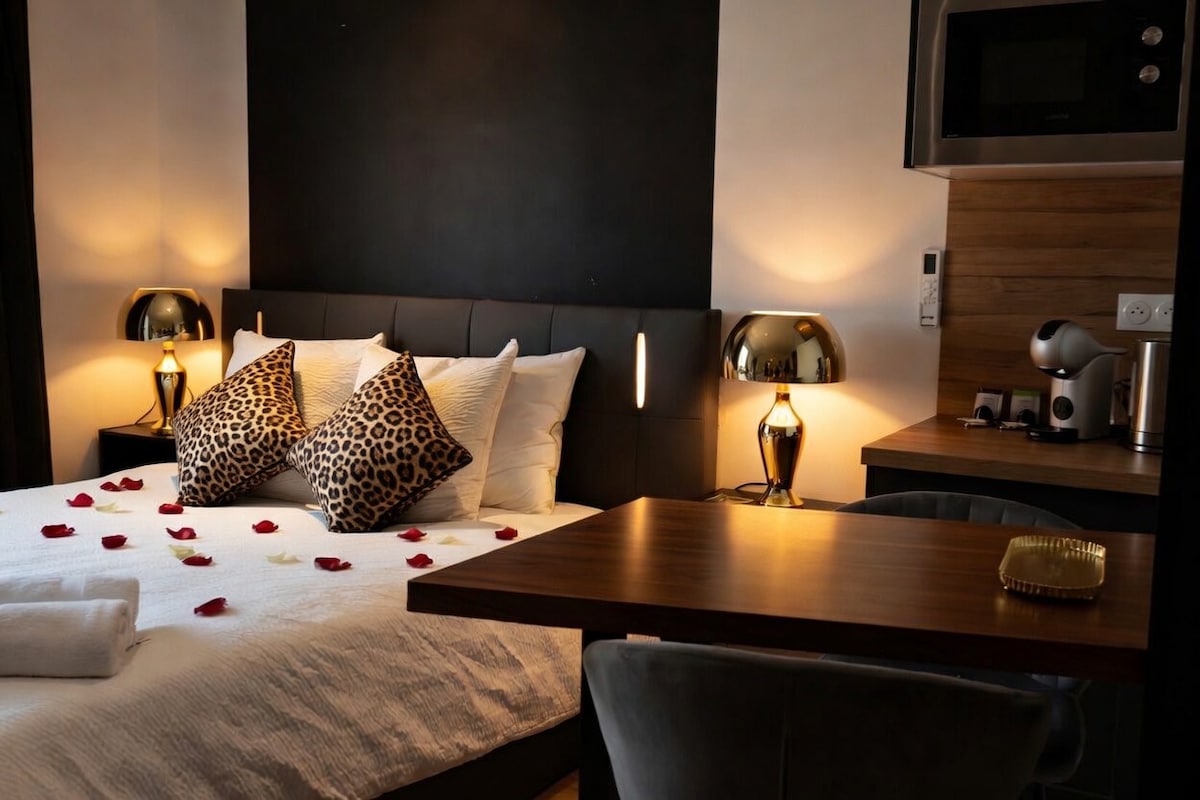 Vivez un séjour d’exception où l’élégance haussmannienne rencontre l’inspiration grecque. Colonnes majestueuses, moulures, rosaces et lustres dorés créent une atmosphère raffinée. Détendez-vous dans la balnéo privée, profitez de la cuisine entièrement équipée, de la chambre élégante et de la salle d’eau en marbre aux finitions dorées. Idéale pour une escapade romantique ou un moment de pur bien-être. La Suite Olympienne – Balnéo Privée, bien plus qu’un séjour : une expérience.