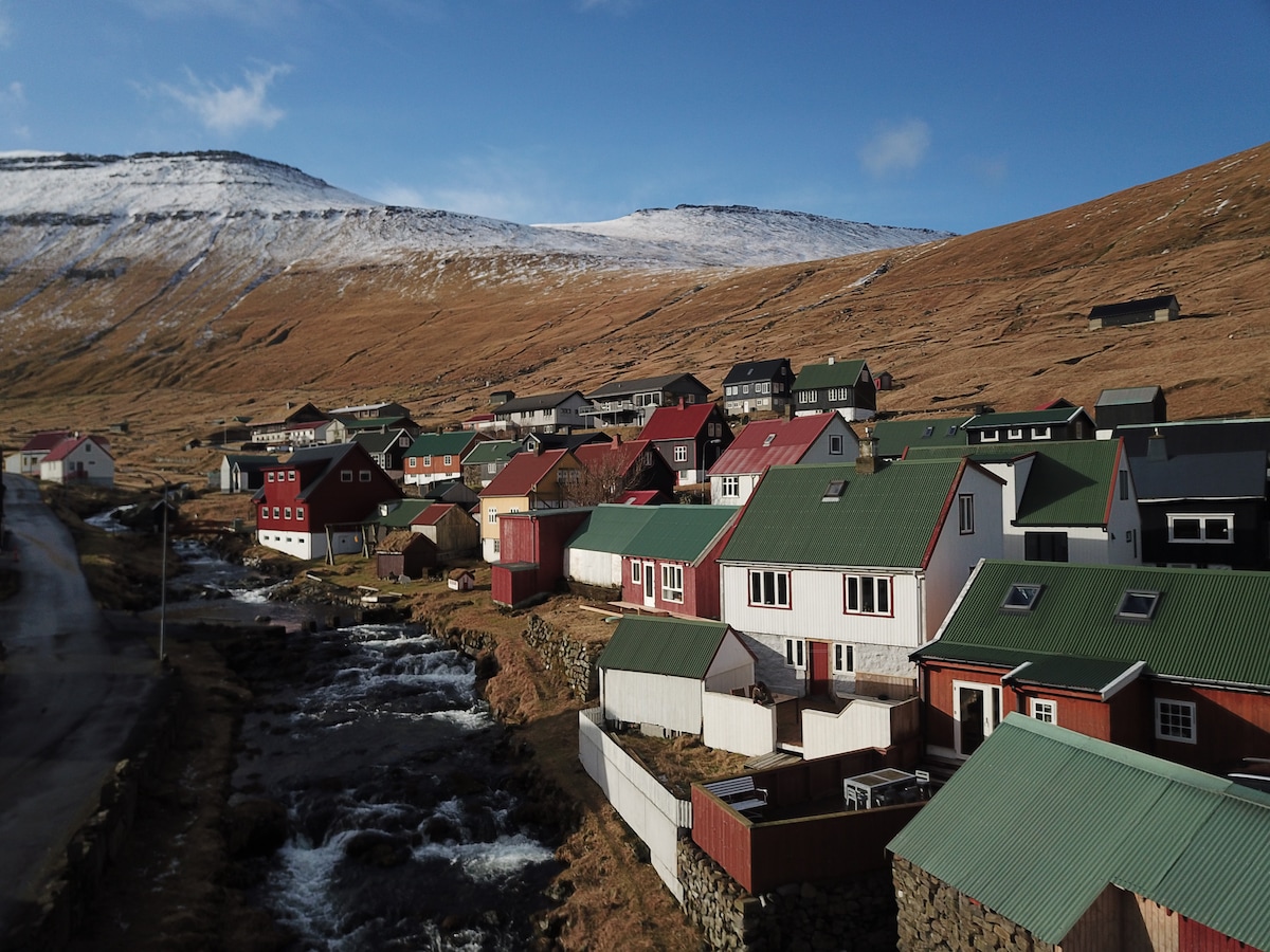 Grand appartement paisible en plein cœur des îles Féroé. Géographiquement central. La plus longue distance en voiture est d'environ 1 heure de route. 6 des îles sont reliées par des tunnels et des ponts. Il est à environ 15 minutes de Tórshavn par le nouveau tunnel sous-marin. Village calme en bord de mer. Belle vue depuis le salon. Vous apprécierez ma maison pour la paix, la vue et les environs.